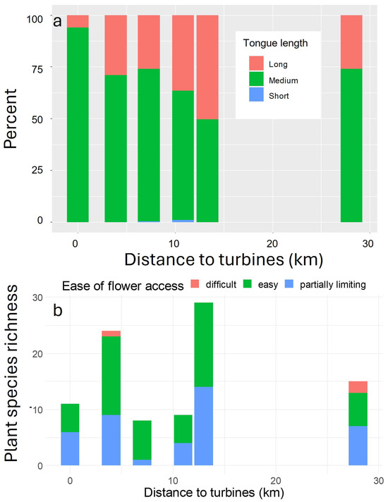 The proportions of bees with short, medium, and long tongue lengths at varying distances from the operating turbines (a). The richness of insect-pollinated flowers varied among the sites, as did the accessibility of nectar (b).