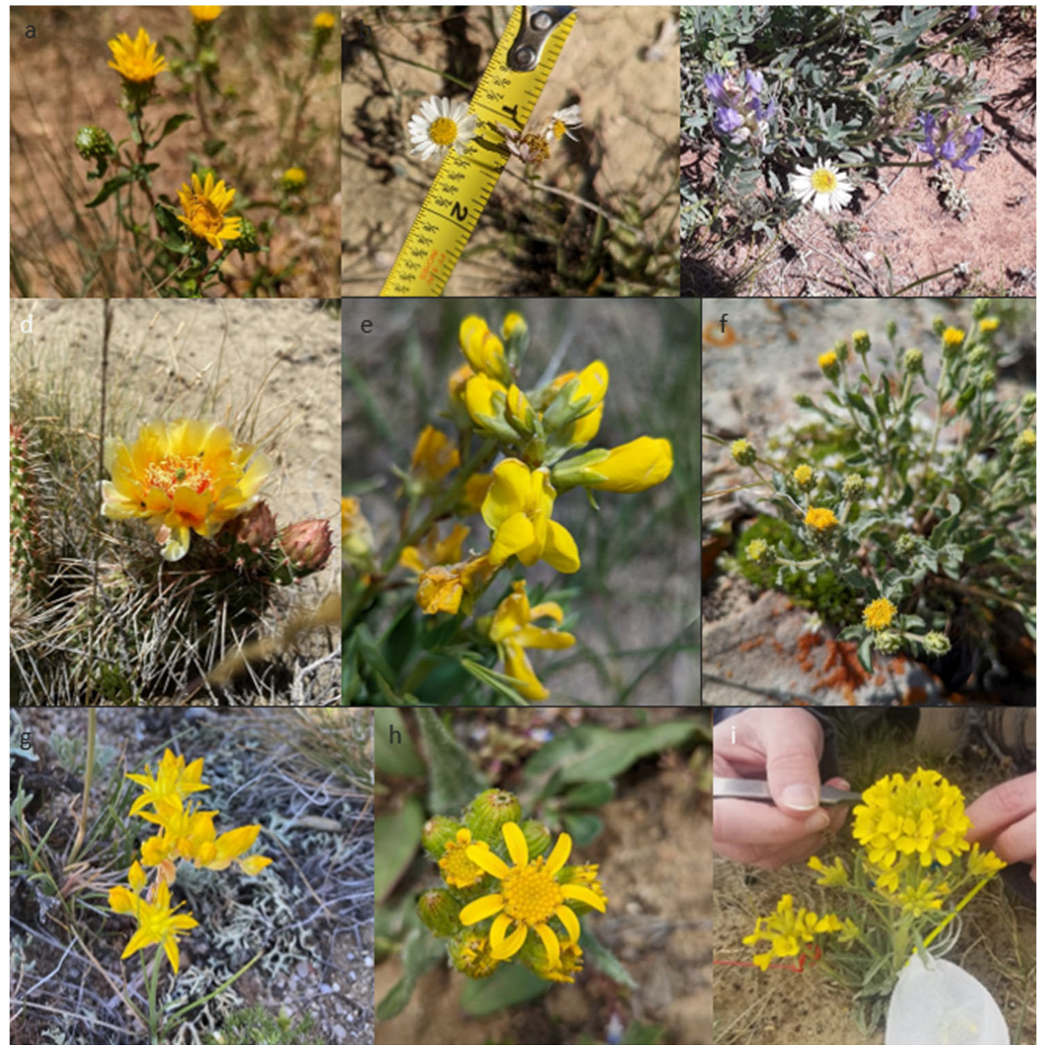 Photos of (a) Curlycup Gumweed, (b) Fleabane, (c) Milkvetch (violet flower), (d) Plains Pricklypear, (e) Prairie Thermopsis, (f) Rayless Tansy-aster, (g) Stonecrop, (h) Tall Western Groundsel, and (i) Western Wallflower. See Table 1 for scientific names.