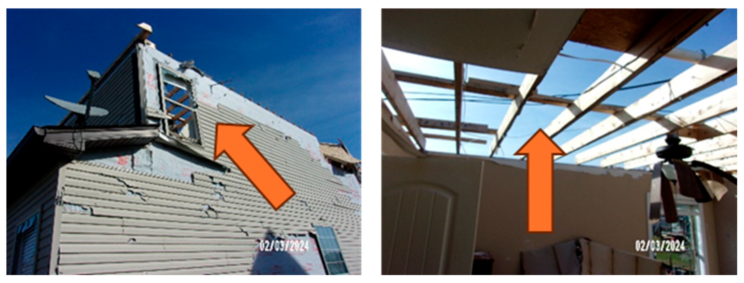 Figure 6). During the structural inspection of the building, several significant damages were identified as a result of tornado-induced wind loading (