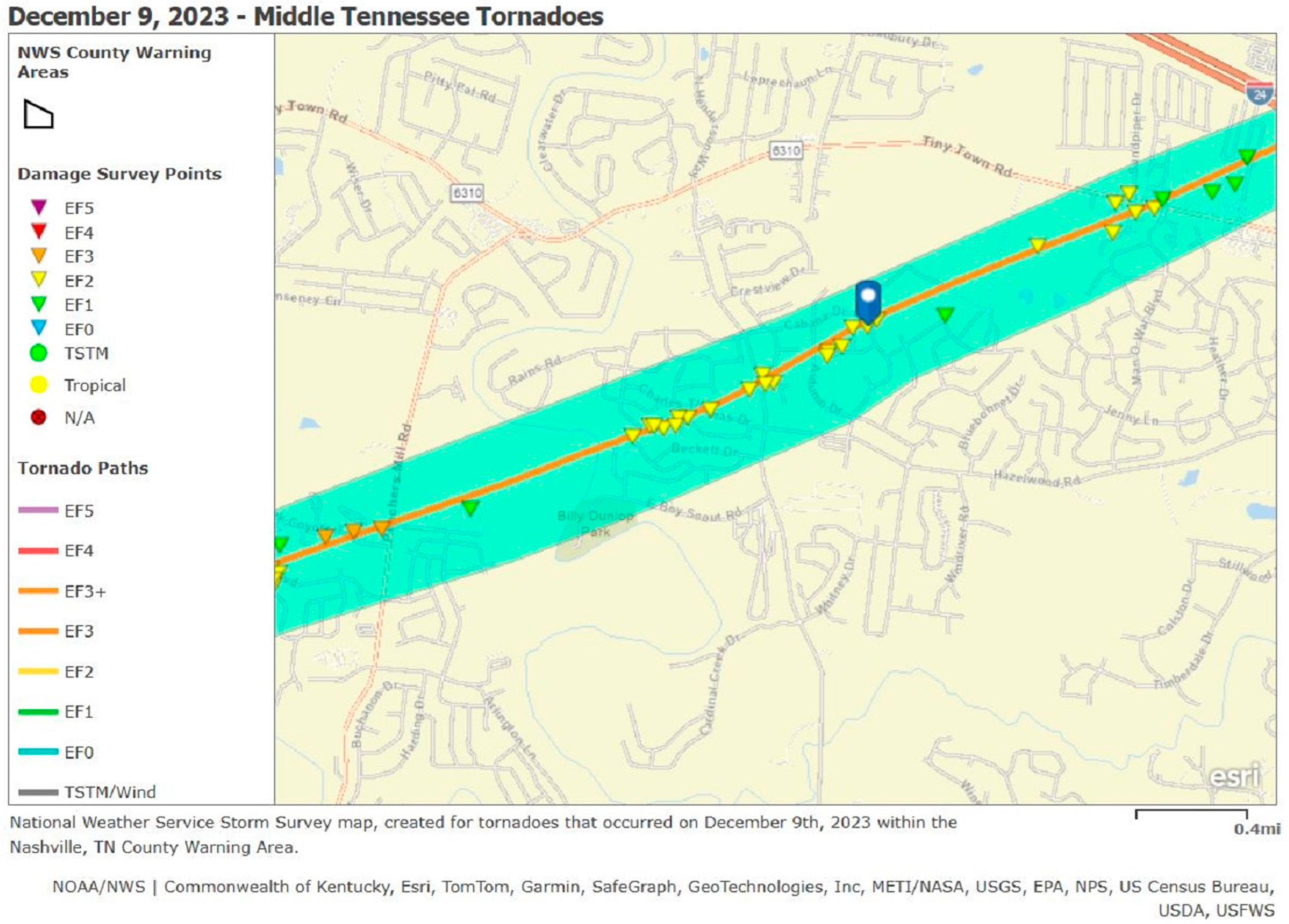 Figure 2 displays the tornado path and illustrates the location of the building in relation to the path. The building is located within the tornado’s estimated damage area of EF2.