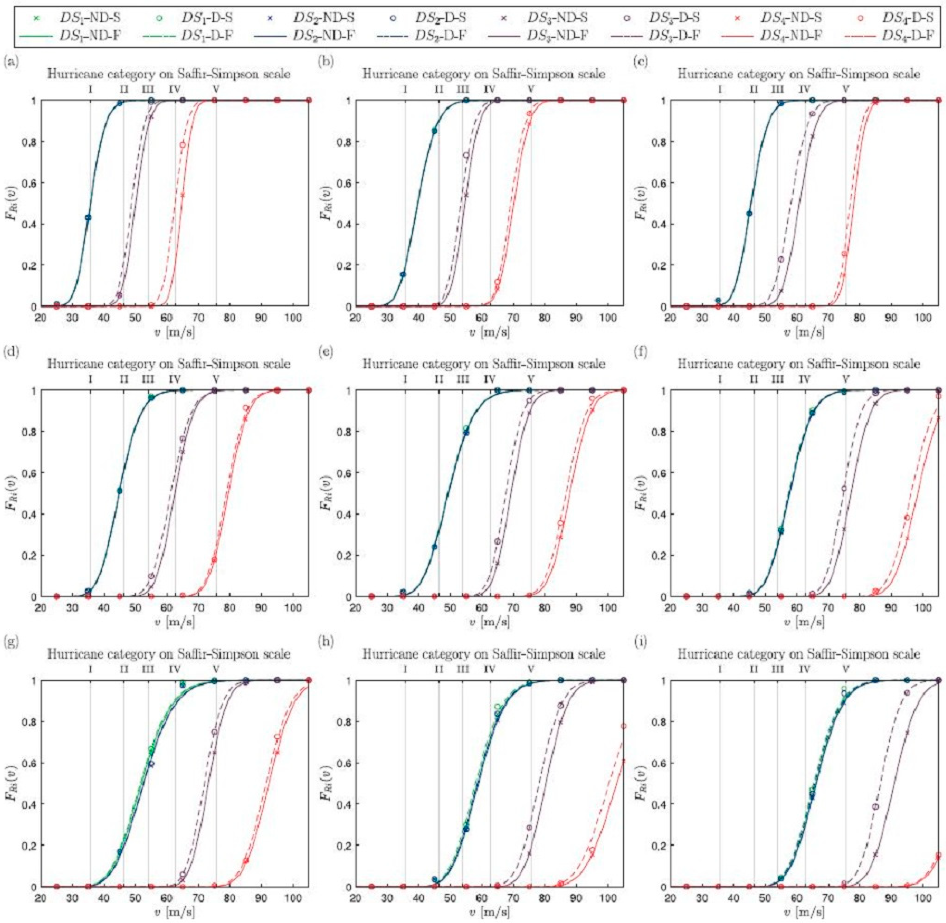 Figure 13 illustrates the fragility functions of low-rise wood-frame buildings subjected to wind events, with and without windborne debris, for a gable-roof building archetype.