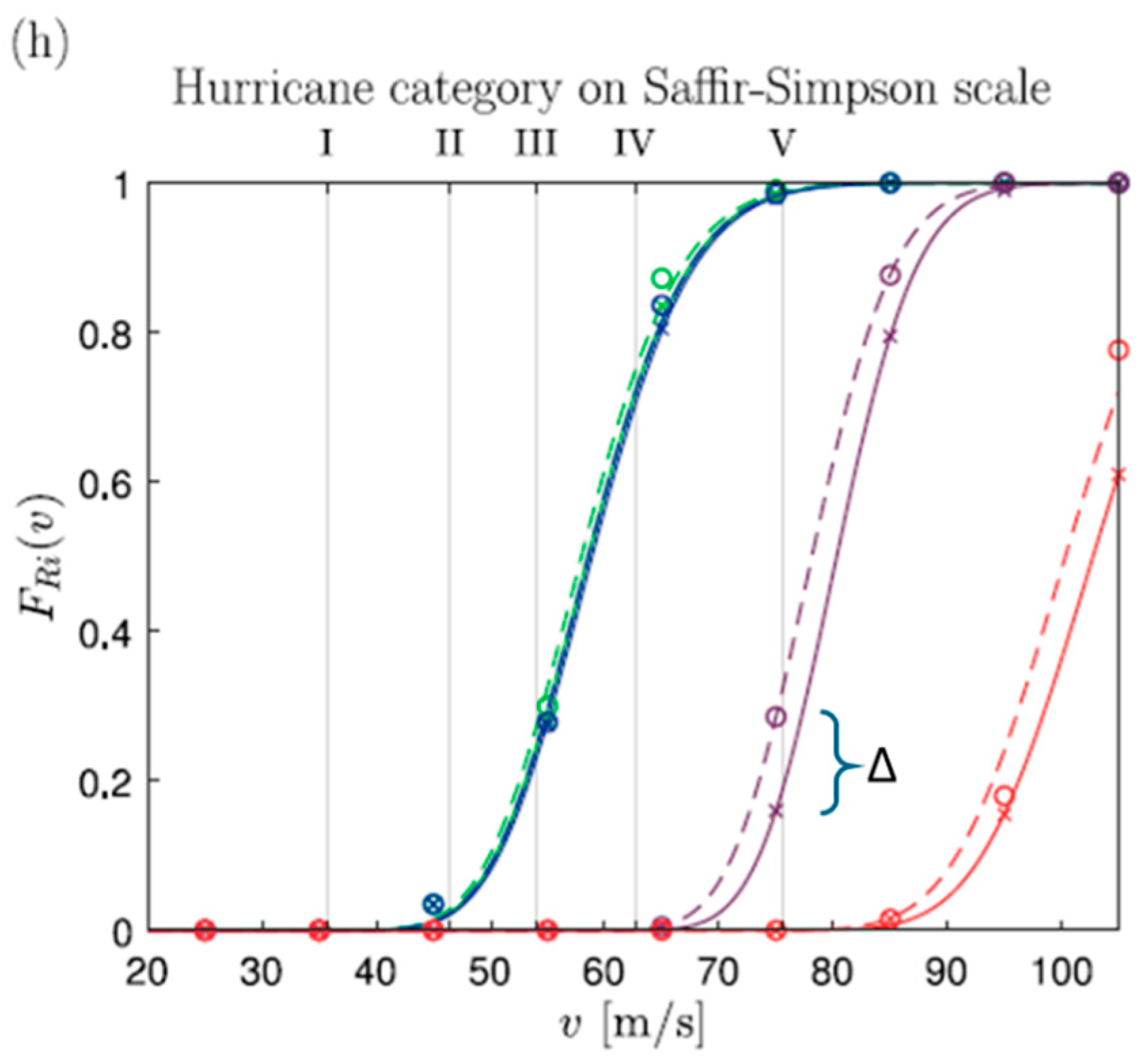 Figure 14 illustrates the difference in damage probability with and without the effect of windborne debris impact. This difference is about a 10% difference in probability of damage, denoted as Δ, and is shown for a representative wind hazard intensity of 75 m per second.