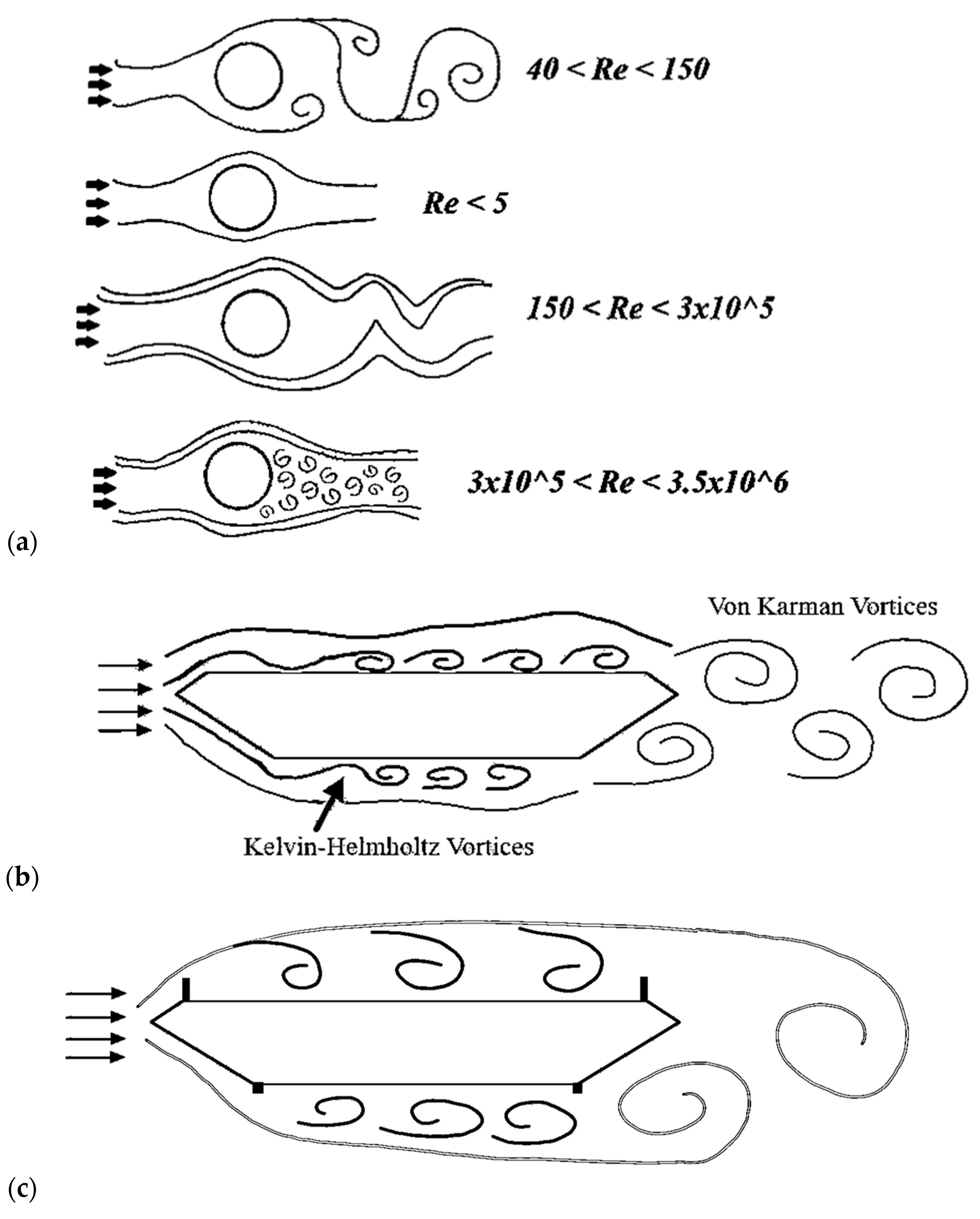 30]. The vortices apply a force normal to the flow direction and, as a result, induce vibrations in the deck. These alternating vortices are called von Karman vortex shedding. The bluff bodies’ Strouhal number (