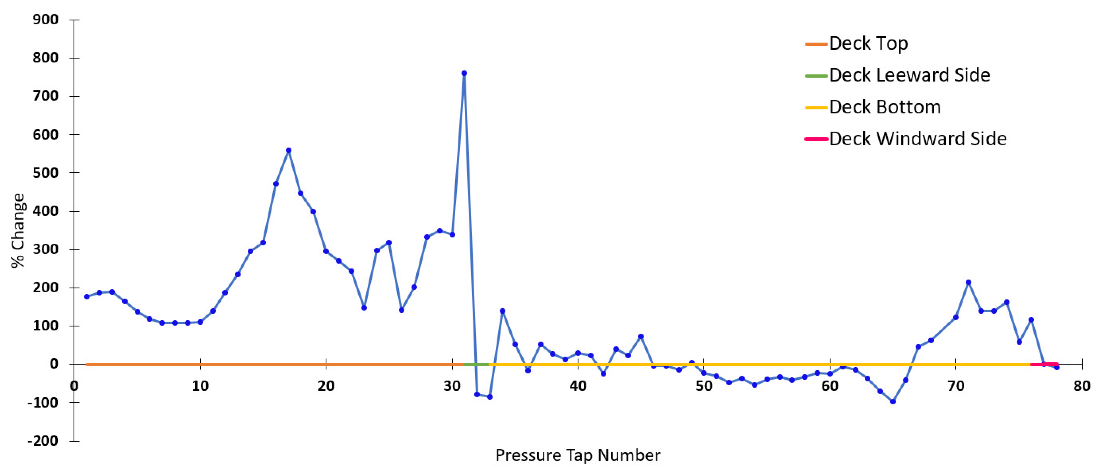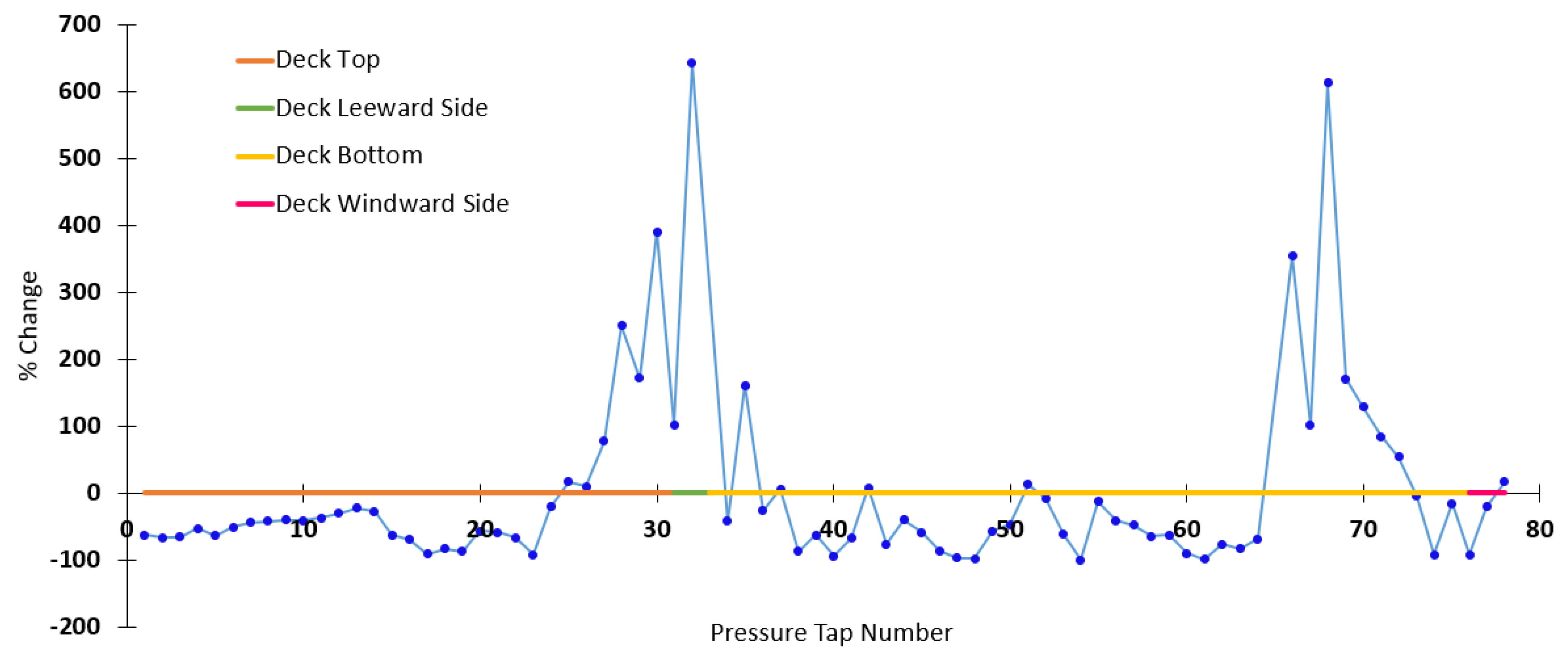 19]. Another study performed in the NRCC wind tunnel tested a 1:10 scale long-span bridge model. It was shown that there is sensitivity of pressure distribution to changes in Reynolds number, especially at larger angles of attack [