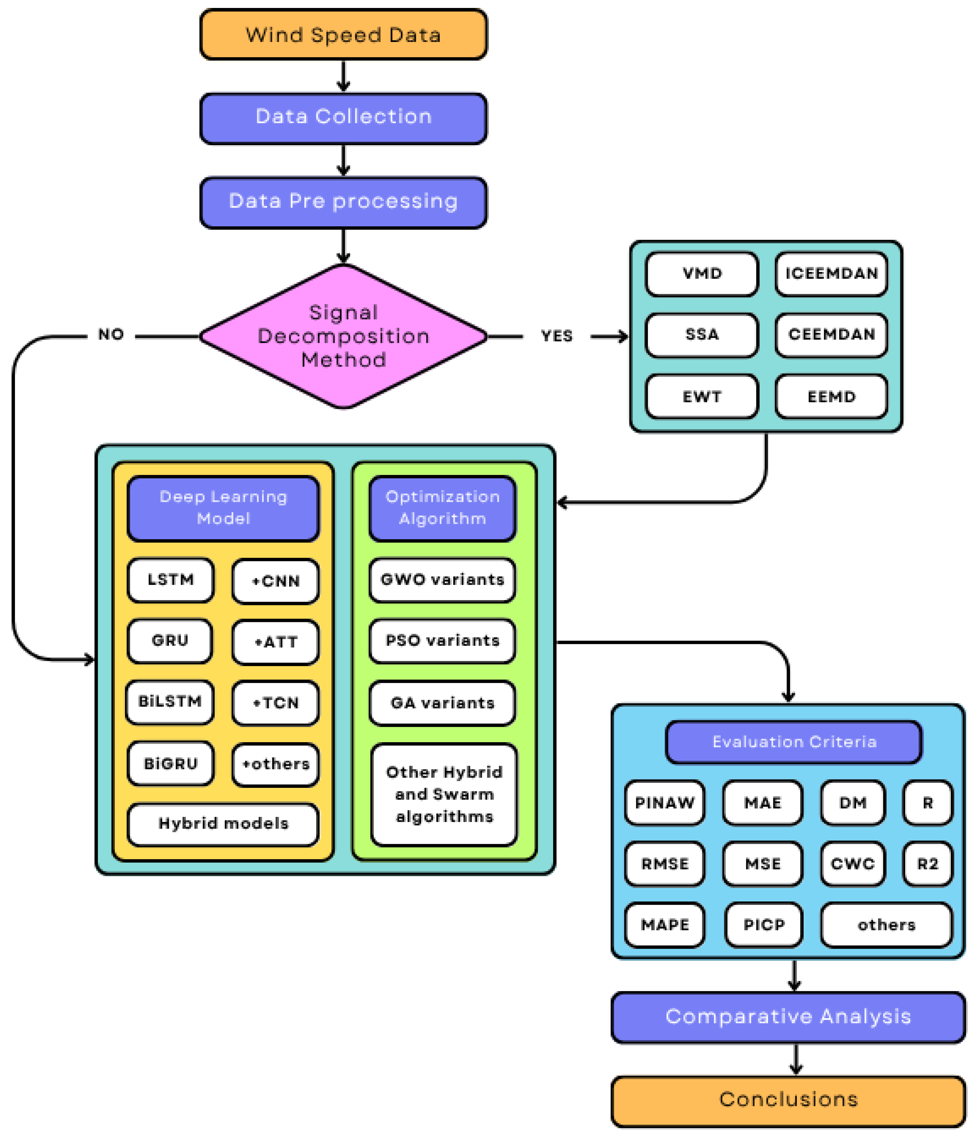 In [5], an extensive review of forecasting methods using DNNs is presented. The paper surveys a range of approaches to WS and WP forecasting, highlighting the strengths and limitations of different DNN models. It also discusses hybrid DNN architectures, preprocessing strategies, feature extraction techniques, and the optimizers commonly applied in these studies. In addition, the review identifies current challenges and outlines future research directions, offering a detailed examination of the performance metrics employed. The authors stress the importance of optimizing model configurations and examine how different forecasting methods have developed and evolved over time.