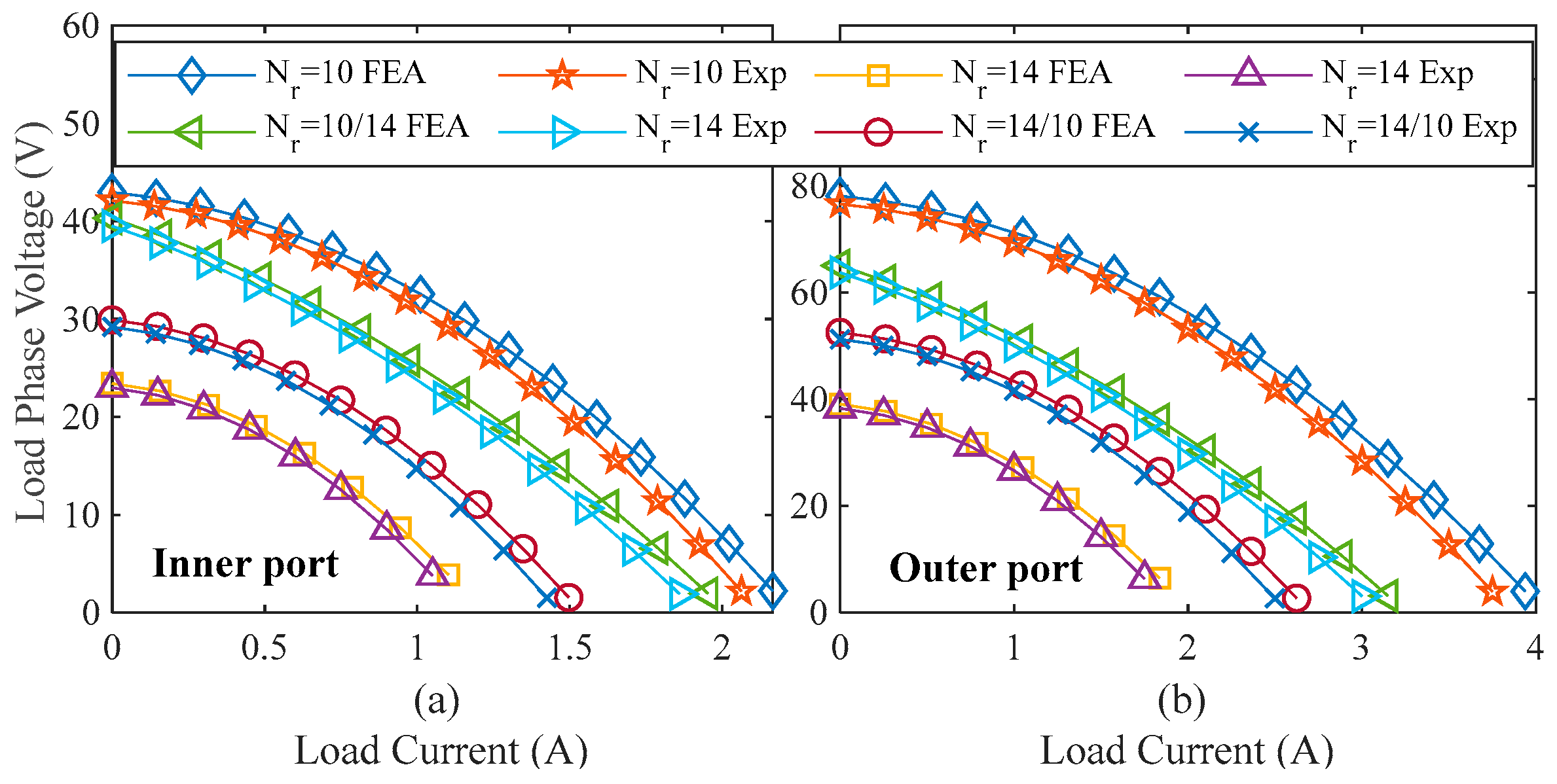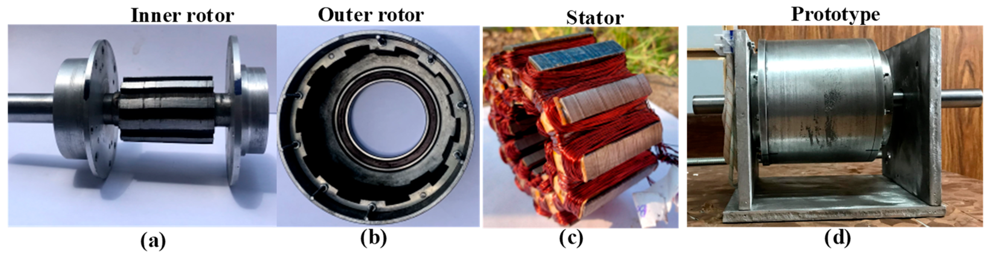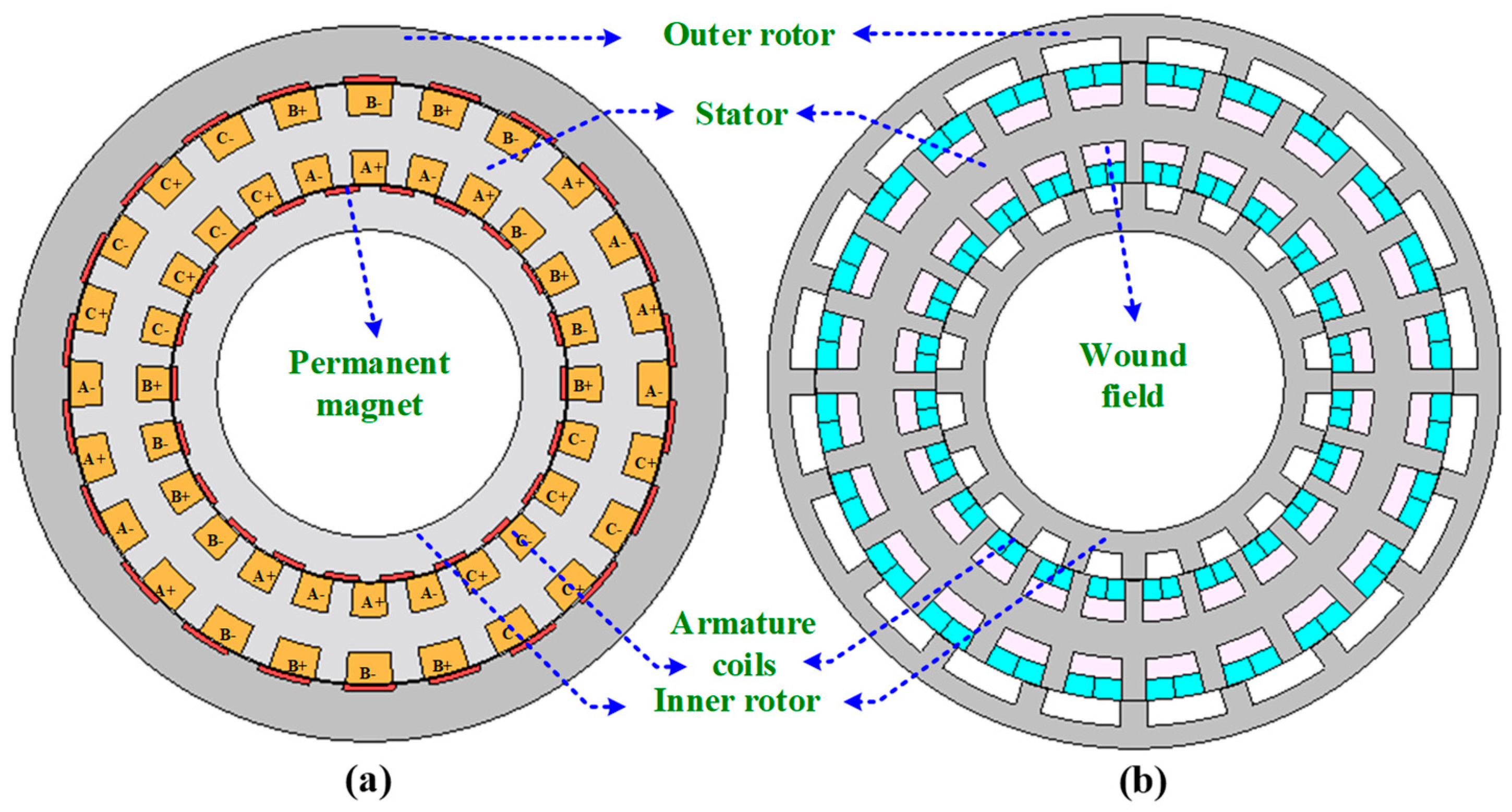 - Ullah, W.; Khan, F.; Hussain, S.; Yousuf, M.; Akbar, S. A Novel Dual Port Dual Rotor Wound Field Flux Switching Generator with Uniform and Non-Uniform Rotor Poles for Counter-Rotating Wind Power Generation. IEEE Trans. Energy Convers. 2023, 38, 2420–2433. [Google Scholar] [CrossRef]
