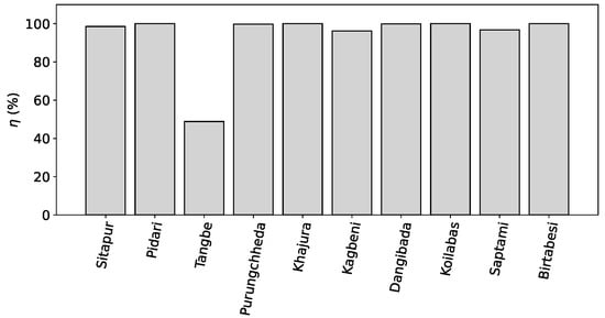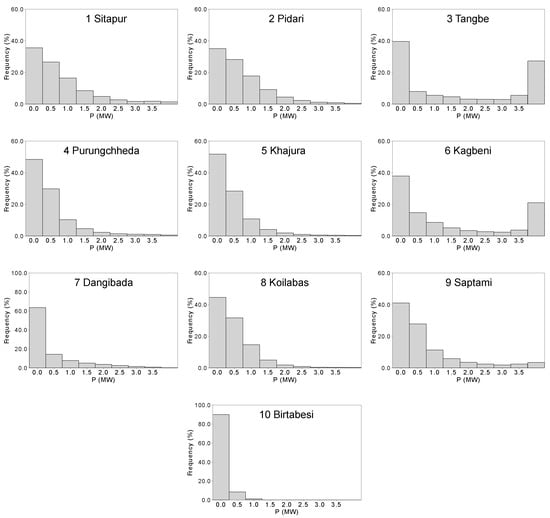 Figure 14 shows the power distribution at all 10 sites. The frequency of occurrence for 0 MW, i.e., when turbine is not in the power production mode, is dominant at all 10 sites. Except for Tangbe and Kagbeni, the largest power production bin is 0.5 MW, thus indicating that the sites have low wind energy potential. Only four sites—Sitapur, Tangbe, Kagbeni, and Saptami—experience sufficiently high wind speeds to generate rated power of 3.6 MW. Although most of the sites presented in this study can be considered to have low wind energy potential, site 6 Kagbeni has higher annual average wind speeds. Similarly, sites 1, 2, and 9, with wind speeds higher than 4 m/s, can still be considered suitable for utility-scale wind turbines with larger rotor areas, which can help to maintain a higher capacity factor.