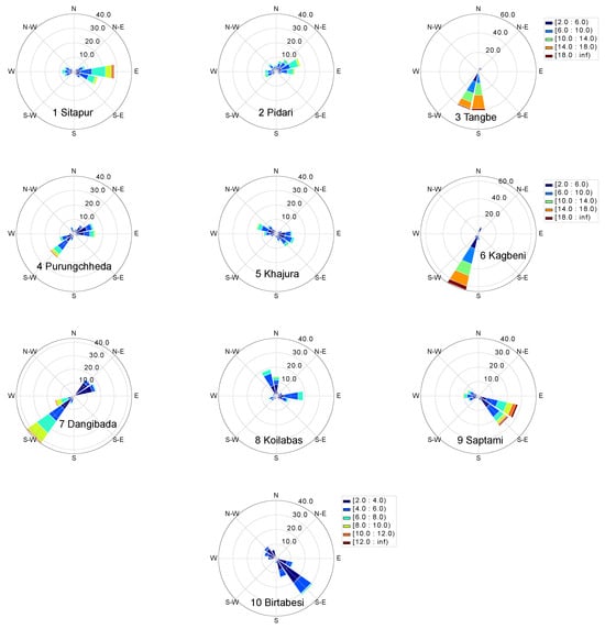 Wind rose showing distribution of wind speeds and wind directions. Wind speed colobar in (10 Birtabesi ) is common for eight of the sites. For (3 Tangbe and 6 Kagbeni), corresponding colobars are included in those subfigures.