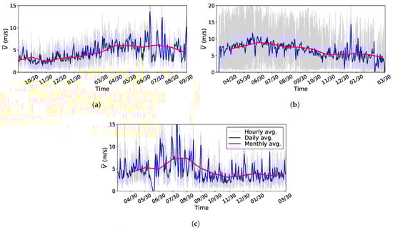 Time series of the hourly, daily, and monthly averaged wind speeds. (a) Site 1 Sitapur; (b) site 6 Kagbeni; (c) site 9 Saptami.