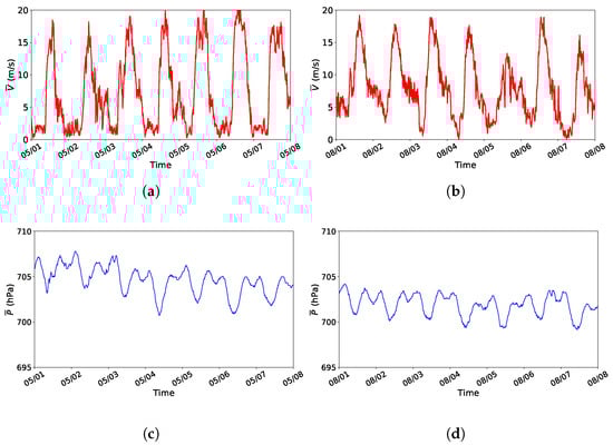 Time series of 10-min average wind speeds and pressures from site 6 Kagbeni. (a,b) Wind speeds; (c,d) pressures. (a,c) From 1 May through 8 May 2019; (b,d) from 1 August through 8 August 2019.
