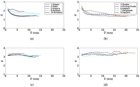 Figure 12 shows the gust and peak factors (see Equation (6)) for all 10 sites computed from the 90th percentile of the corresponding parameters for the wind speed bin. For clarity, (a) and (c) show the parameters for the sites with relatively flat terrain, while (b) and (d) present those for sites with complex mountainous terrain. It is interesting to observe that gust factors and peak factors at most of the sites converge to similar values at higher wind speeds. However, this is not the case for site 8 Koilabas and site 10 Birtabesi. Studies have shown that gust factor (G) values lie between 1.2 and 1.8, while the expected values of peak factor (g) generally lie between 3 and 4 (see, e.g., Holmes []). The IEC standard recommends and . Table 3 summarizes gust and peak factors at the maximum mean wind speeds observed in Figure 12. Except for sites 8 and 10, gust factor values are roughly around 1.4. Similarly, peak factor values are around 3 for most of the flat-terrain sites and around 3.4 for most of the complex-terrain sites.