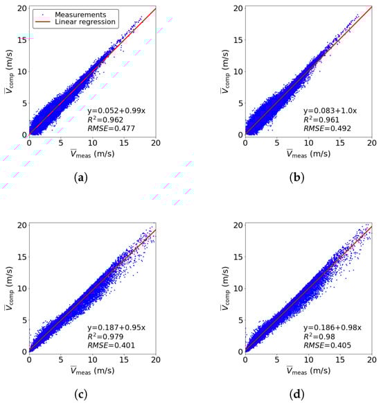 Comparison of wind speeds obtained from the power law against the measured wind speeds at the height of 80 m. (a) Sitapur: from sector-averaged wind speed; (b) Sitapur: from sector-averaged ; (c) Saptami: from sector-averaged wind speed; (d) Saptami: from sector-averaged .