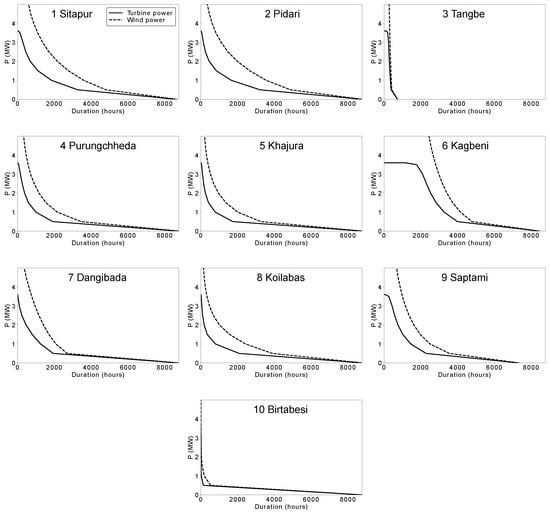 Figure 15 shows the power duration curves describing the number of hours in the measurement period (one year in the current study) for which the wind power and power output of the reference turbine are equal to or higher than each particular value. Turbine power is obtained from the measured wind speeds, and the corresponding power output is determined using the power curve. For reference, the available wind power () is also shown. Of the 10 sites, only Kagbeni is capable of producing the rated power of 3.6 MW for a significantly long duration (more than 1800 h). However, the total duration for which the wind turbine could have generated 1 MW or more is more than 1500 h for the three sites with capacity factors greater than 15% in Table 5.