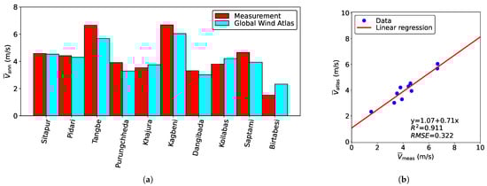 Comparison of annual average wind speeds for all 10 sites against the wind speed obtained from the Global Wind Atlas. (a) Bar diagram; (b) distribution plot with a linear regression line.