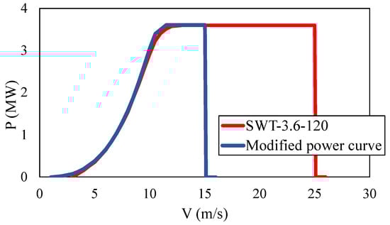 Power curve of SWT-3.6-120 and modified power curve with reduced cut-in, rated, and cut-out wind speeds.