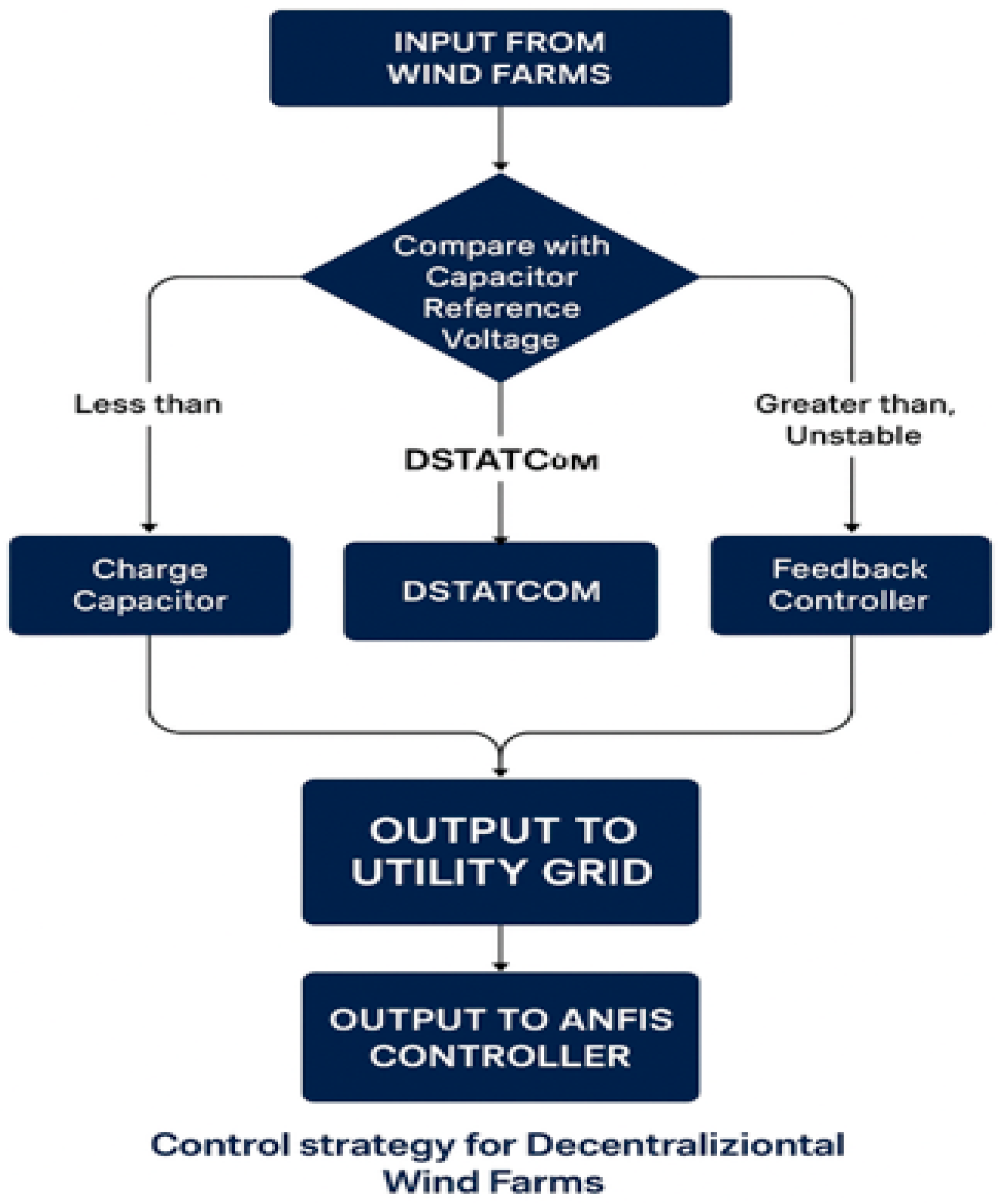 Figure 3. It is a decentralized system in which wind farms are connected in parallel and can be switched off according to the requirement for the desired voltage gain. In order to check the voltage across each wind farm, a capacitor is connected to check the voltage that is coming from the wind farm, which compares it with a reference voltage of the charged capacitor, and then sends it to the end-user, i.e., in the utility grid. Wind turbines are connected in a decentralized pattern to measure voltage and frequency across the capacitive circuit. If the variation still exists in any connected turbine, then switching of the turbines will occur. When the desired voltage reaches the distributive power generation, it will again be sent to DSTATCOM. If it is stable, it is then passed to the grid at a given load; otherwise, the ANFIS controller will check the fault and voltage instabilities, which are then forwarded to DSTATCOM to stabilize the frequencies and voltages.