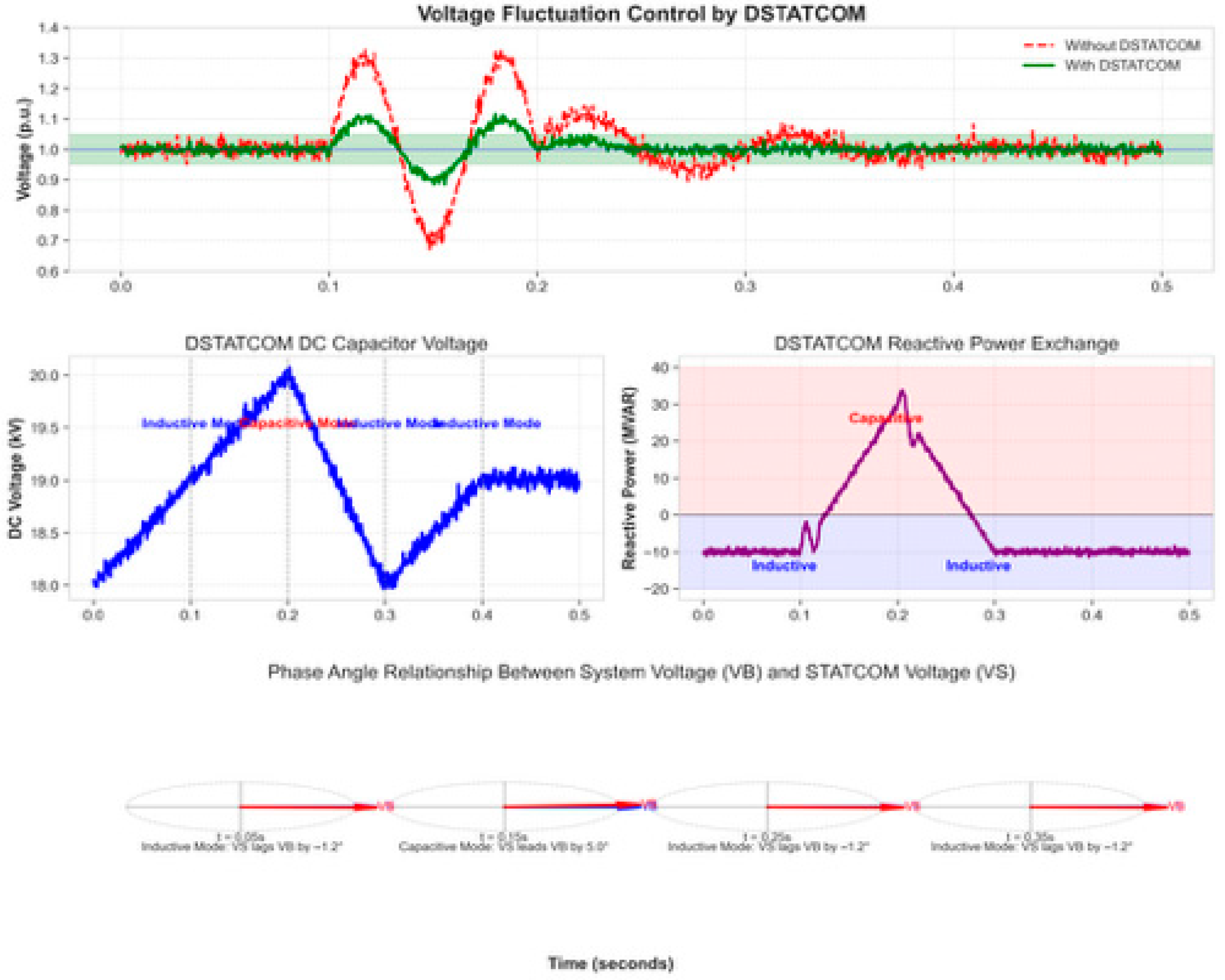 24] detailed fundamental DSTATCOM operational principles for voltage regulation, incorporating phase-specific filter capacitors to eliminate high-frequency switching anomalies while maintaining nominal voltage through reactive power control.