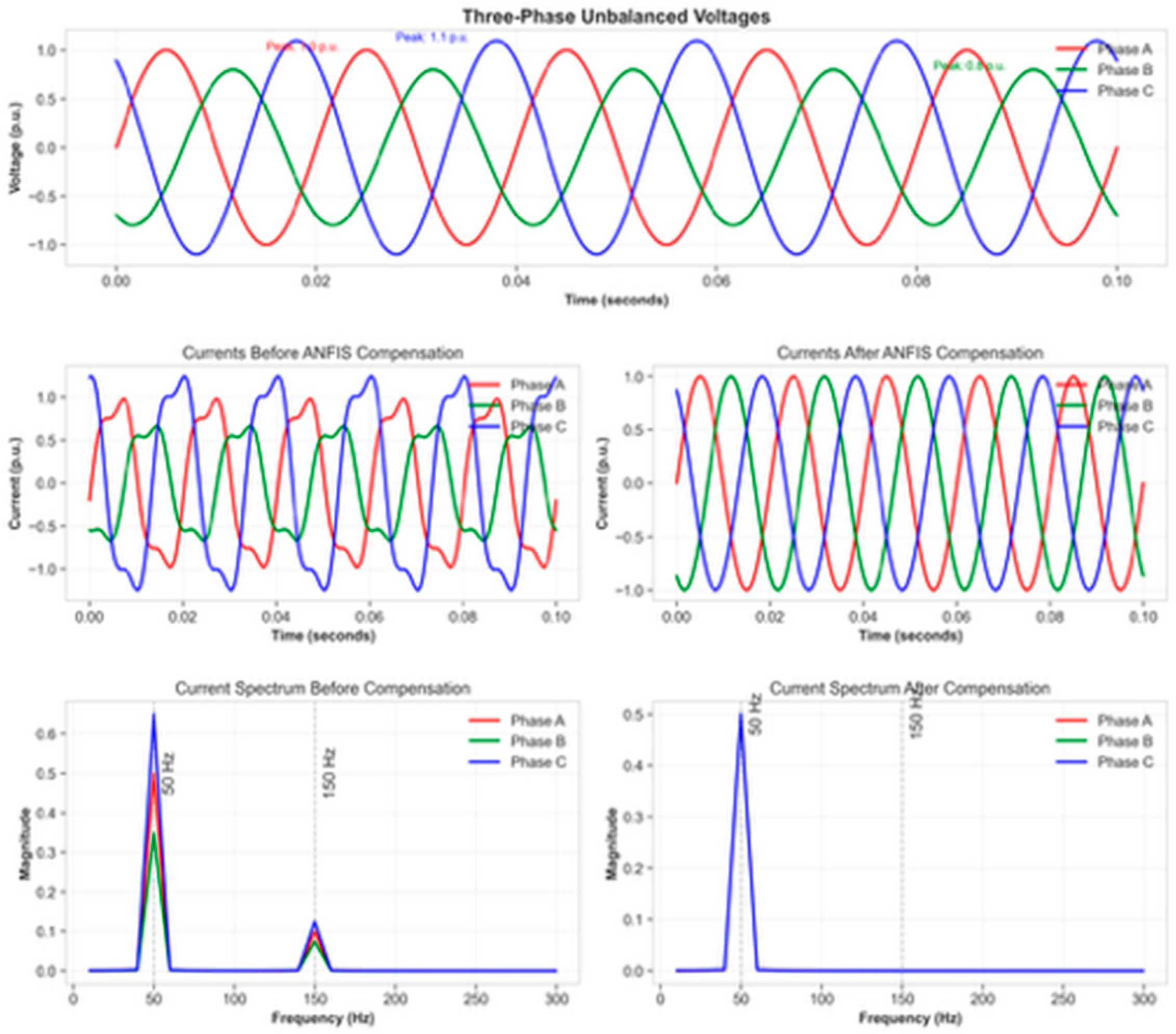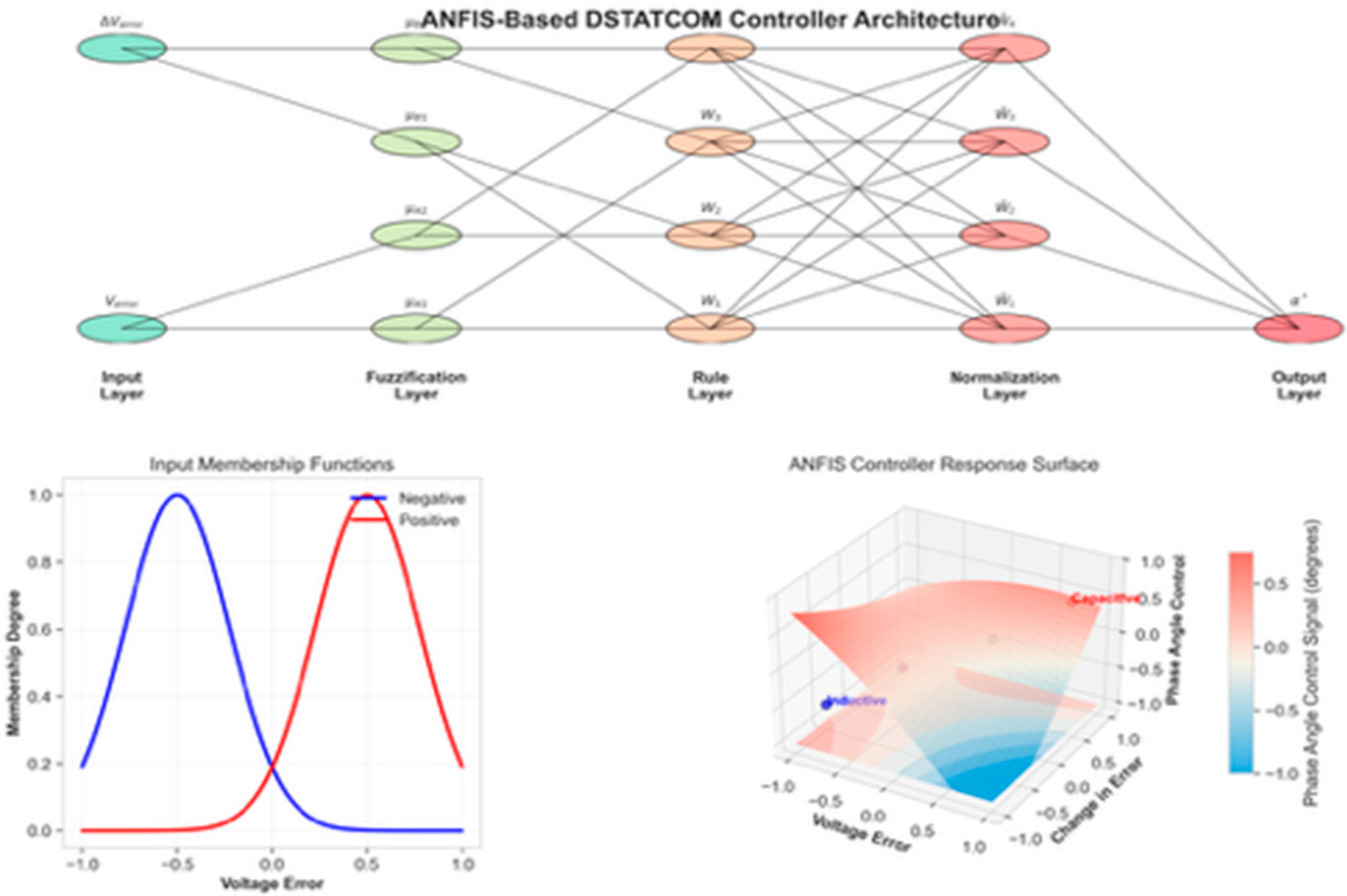 30] proposed a hybrid ANFIS-PI-based robust control system for wind turbine power generation, demonstrating enhanced transient response and improved fault ride-through capability under fluctuating wind speeds. In comparison, the proposed ANFIS-controlled DSTATCOM in this study provides superior reactive power compensation efficiency and reduced total harmonic distortion due to its decentralized adaptive feedback design.