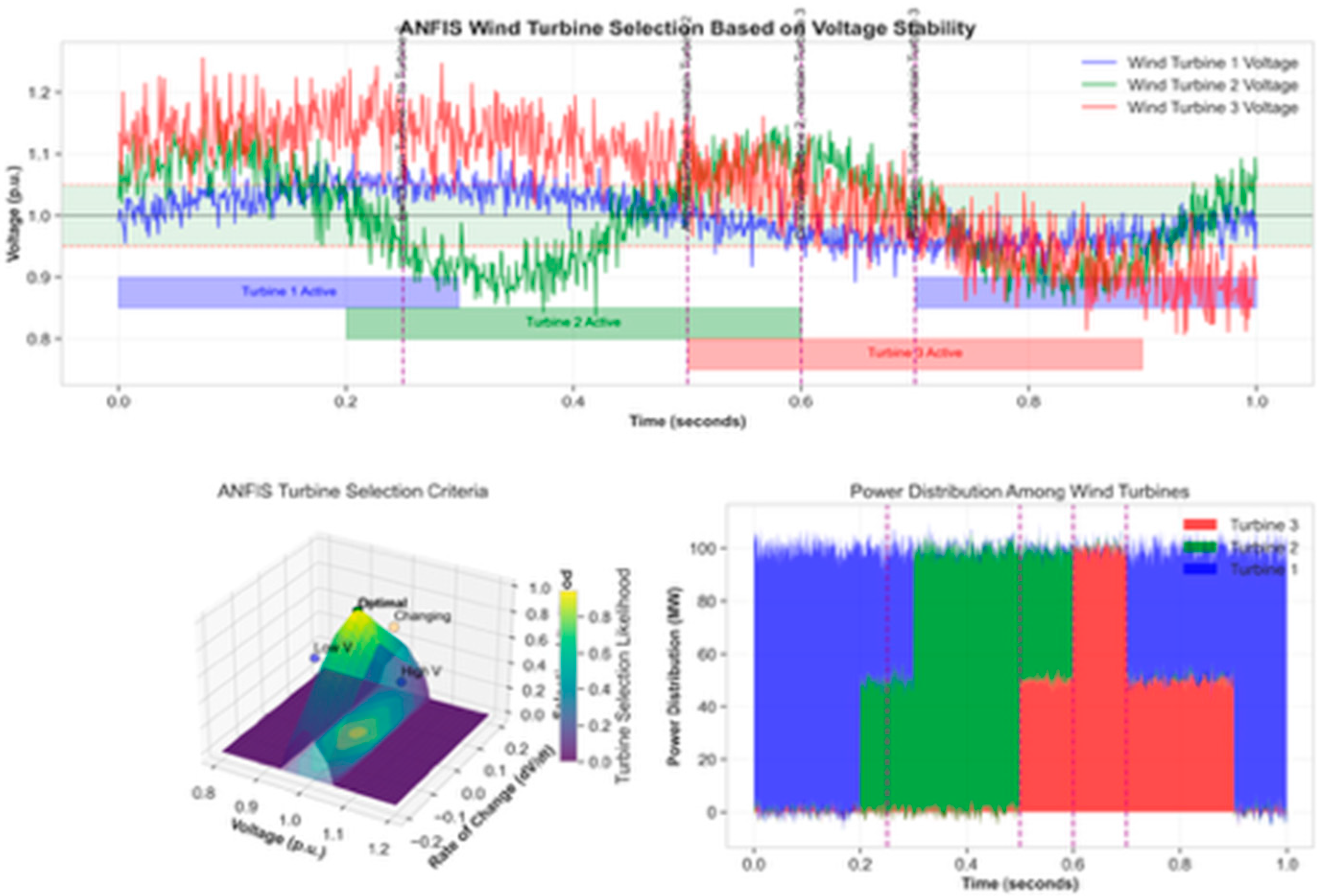 The propsed decentralized architecture with parallel turbine configuration allows for selective operation based on optimal wind conditions at individual turbines. This capability, combined with the ANFIS controller’s adaptive response, enables the system to maintain stable voltage profiles even under highly variable wind conditions. The voltage stability remained within ±5% of the nominal values across wind speed variations from 3 m/s to 25 m/s—a performance level unmatched by previous approaches.