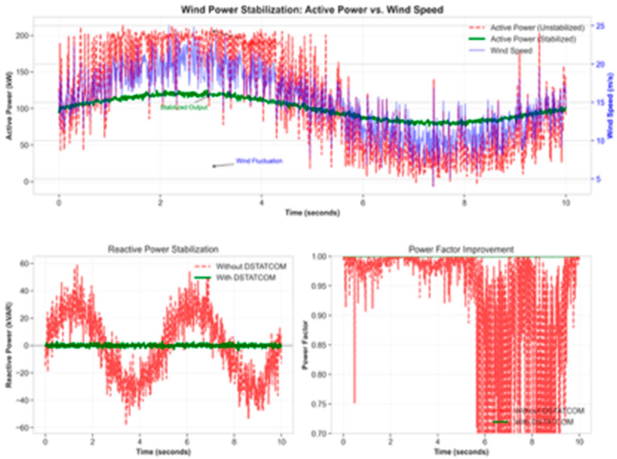 For large-capacity wind farms in the 2–3 MW range operating within wind speeds of 3–25 m/s, the proposed ANFIS-based DSTATCOM maintained voltage variations within ±2% and frequency deviations below ±0.15 Hz. During sudden wind speed or load changes, the adaptive control loop enhanced transient damping and ensured faster voltage recovery, with restoration occurring in less than 0.4 s under high turbulence. Compared with conventional STATCOM systems reported in the existing literature, the proposed configuration provided a 20–25% improvement in voltage stabilization efficiency and achieved smoother frequency control across variable-speed operating conditions.