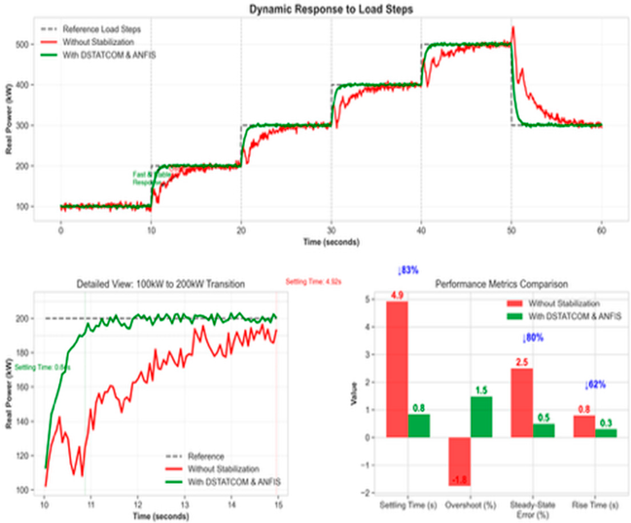 The proposed ANFIS-controlled DSTATCOM implementation delivered substantially faster response time (0.3 s) compared to conventional PI controllers (0.8–1.2 s), as documented in [