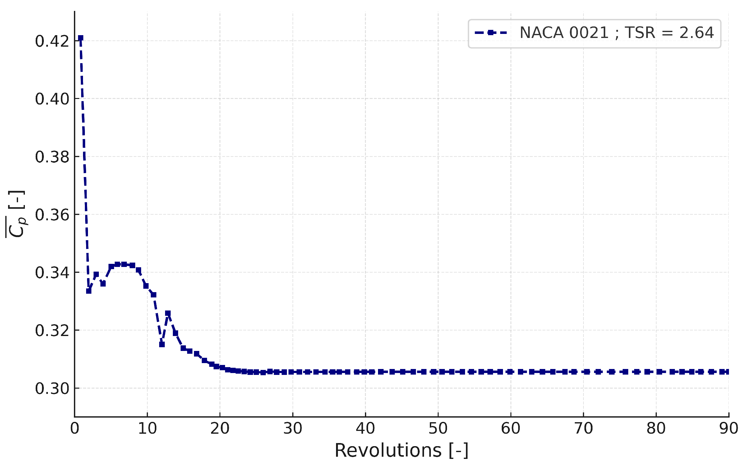 Numerical verification: average power coefficient () across revolutions for the NACA 0021 reference case at . Convergence is achieved after approximately 20 revolutions.