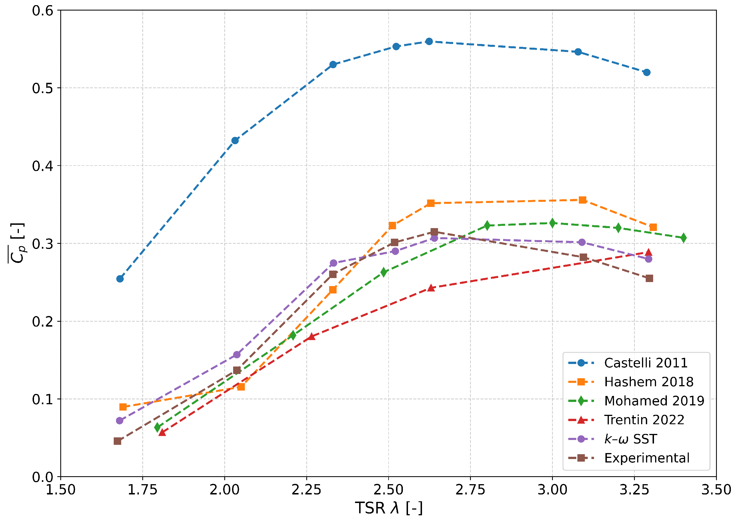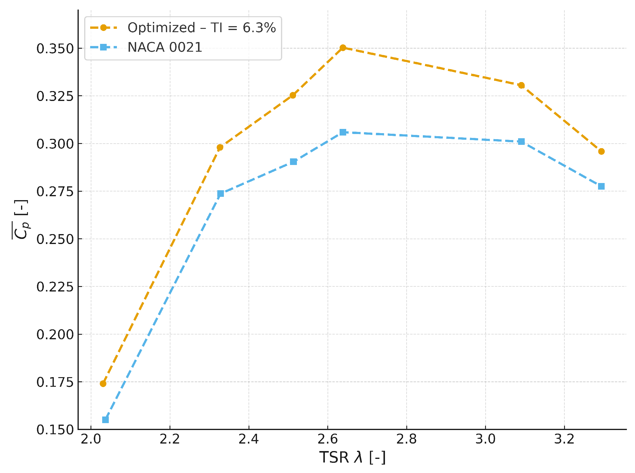 Cycle-averaged power coefficient () for the NACA 0021 and optimized profiles across the studied tip-speed ratios. The optimized profile achieves 11–14% improvement, confirming the robustness of the multi-TSR optimization strategy.
