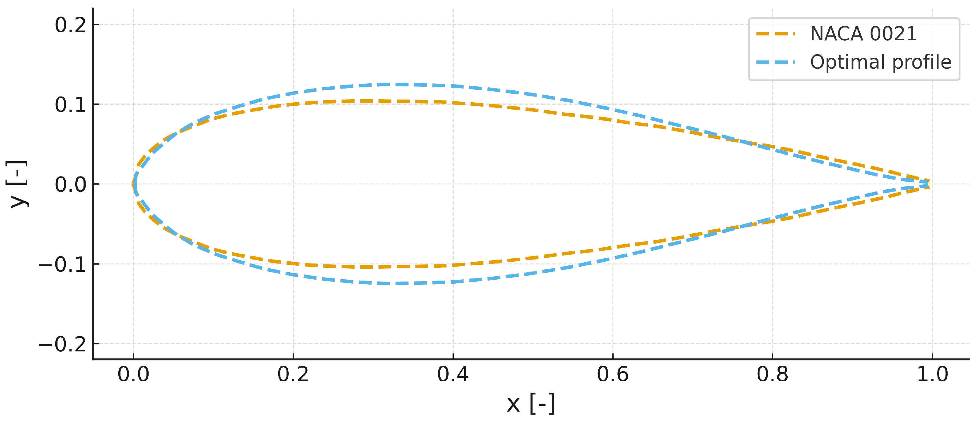 Comparison between the optimized airfoil and the baseline NACA 0021 profile. The optimized design features increased camber and a forward-shifted maximum thickness, improving flow attachment and aerodynamic efficiency.