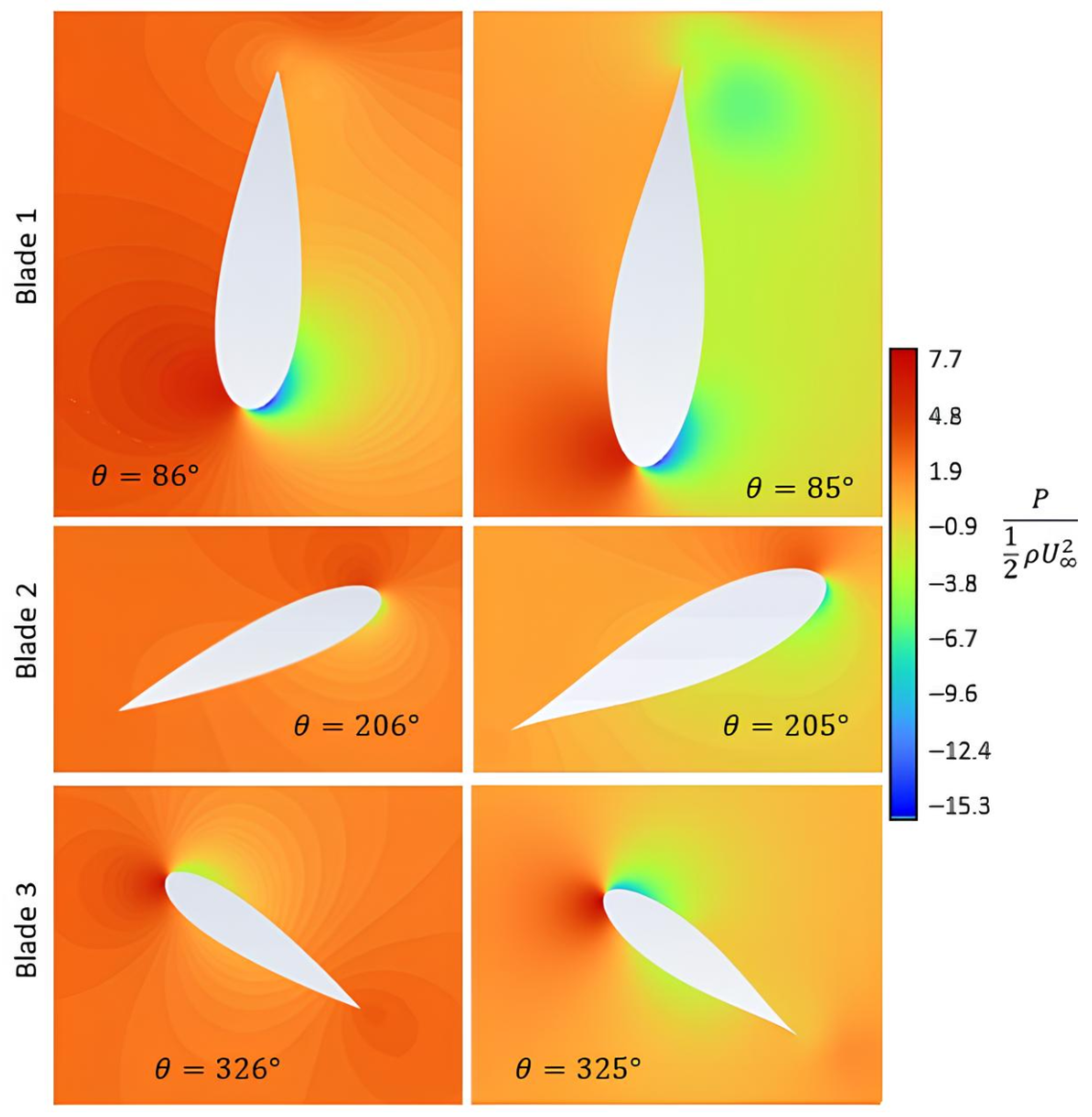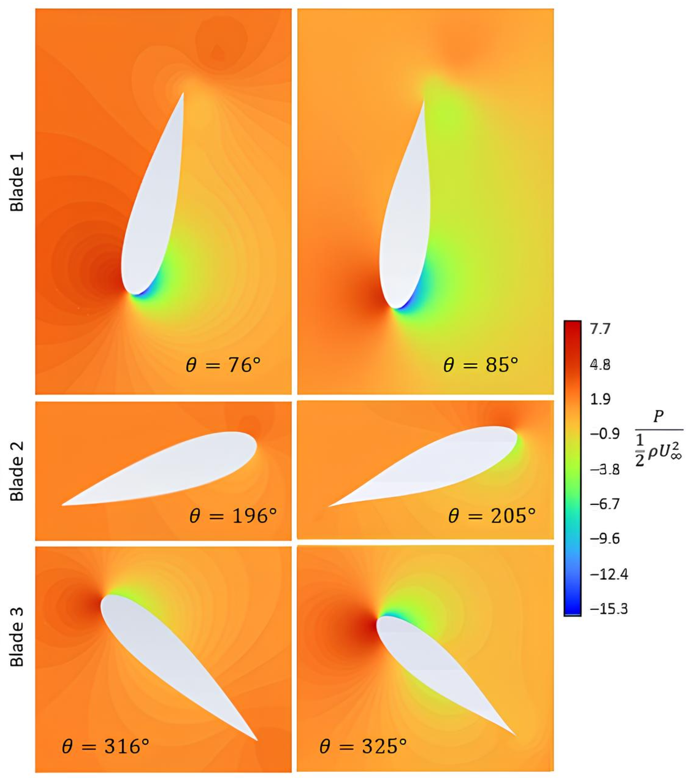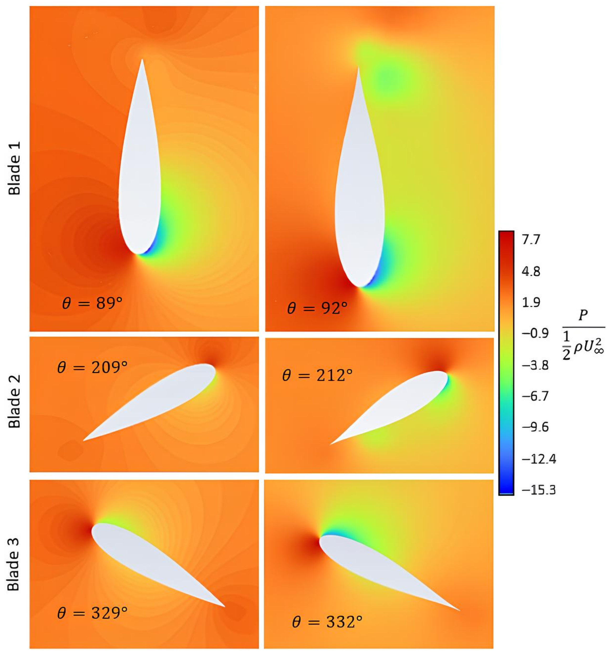 Dimensionless pressure contours at for the three blades of the NACA 0021 (left) and optimized profile (right) at the azimuth of the highest torque coefficient.