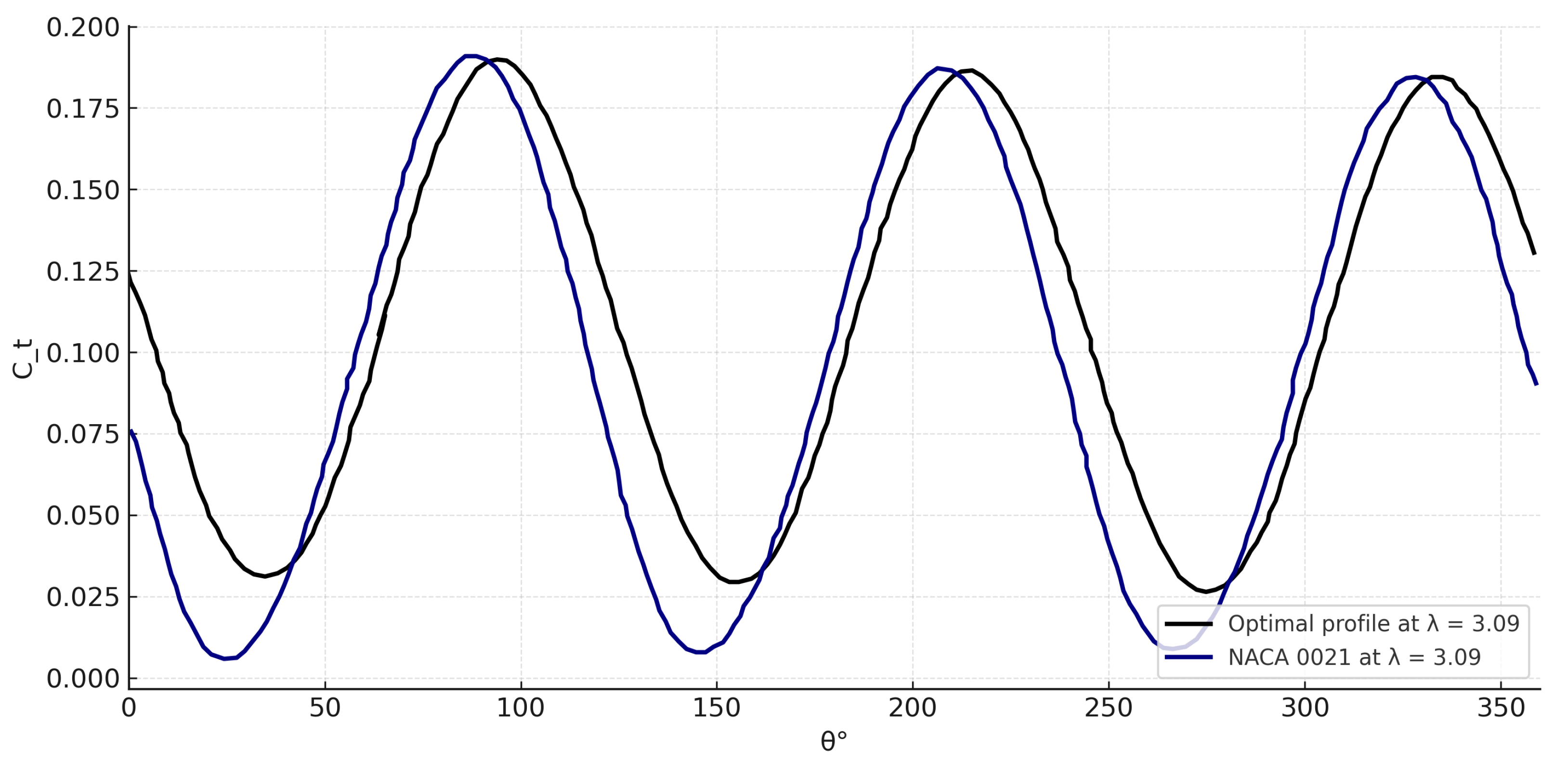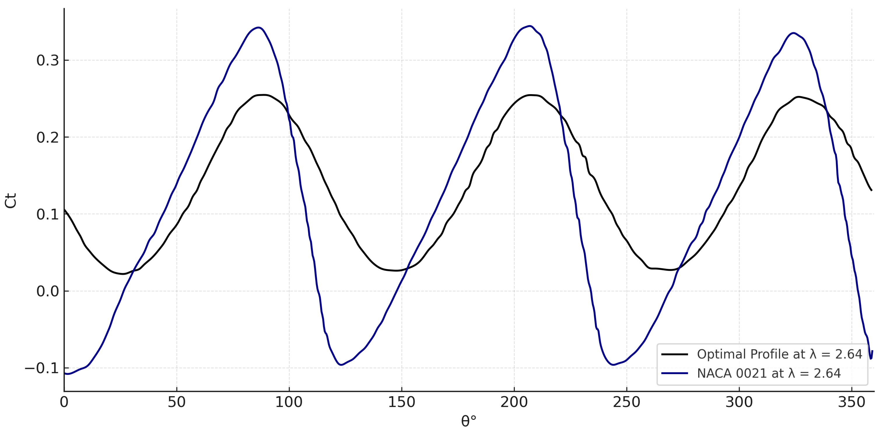Instantaneous torque coefficient () for the NACA 0021 and optimized profiles at . The optimized profile exhibits reduced negative-torque regions and improved rotational consistency.