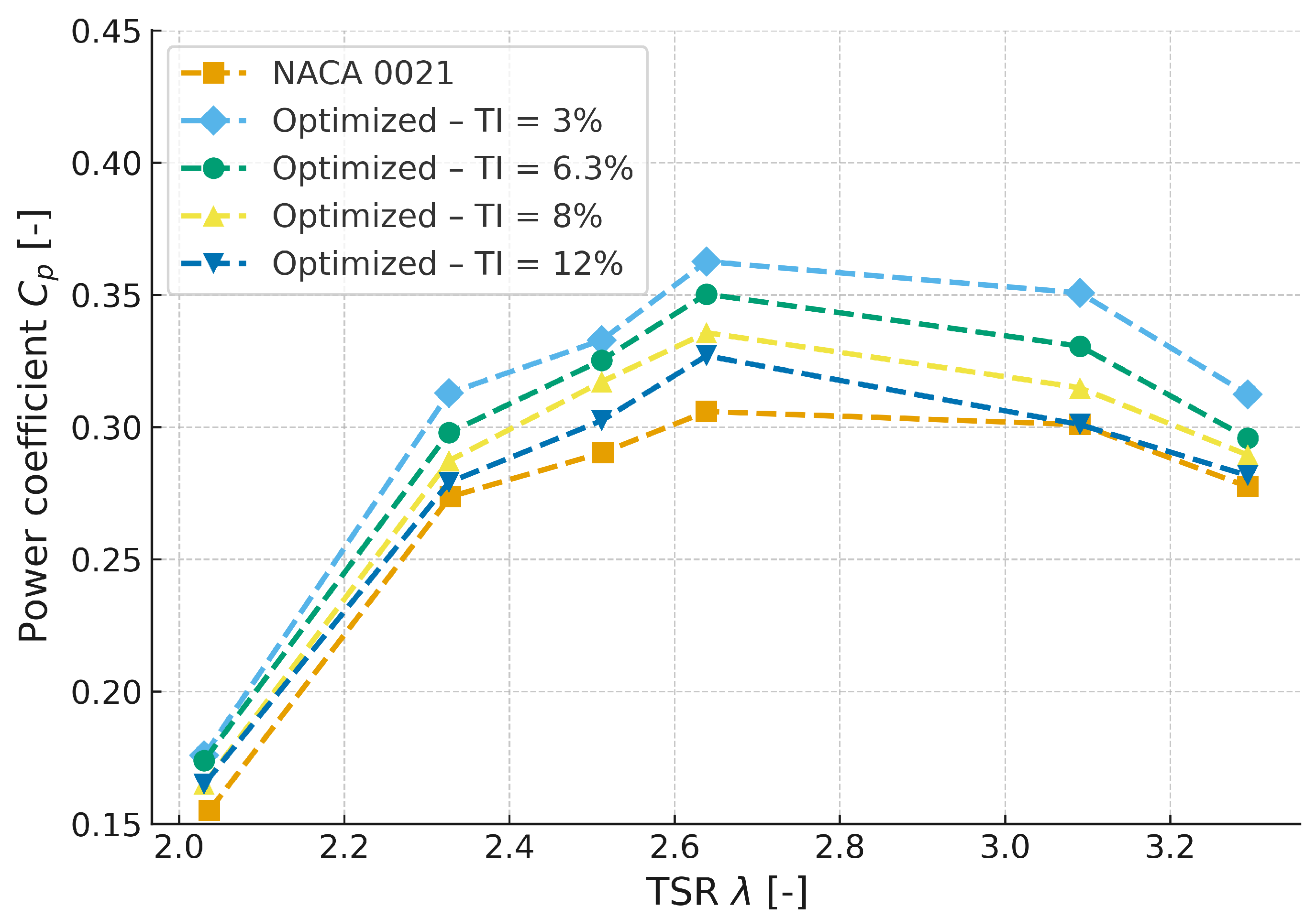 Power coefficient as a function of tip-speed ratio for the optimized airfoil under different turbulence intensities (3%, 6.3%, 8%, 12%). Results for the baseline NACA 0021 profile are shown for comparison.