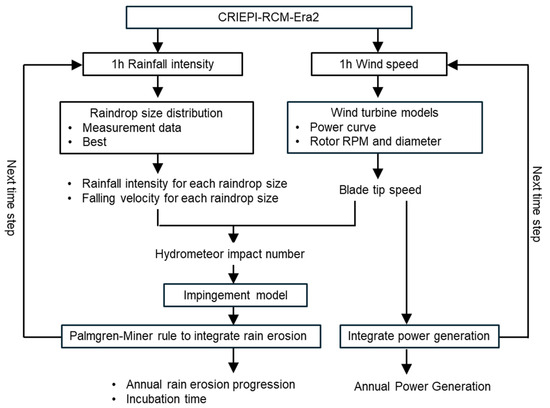 The objective of this study is to provide the first rain erosion atlas for wind turbine blades in and around Japan. We employed CRIEPI-RCM-Era2, a long-term high-resolution reproduction dataset [15] developed by our institute. This is because the dataset has been extensively used to evaluate hazards associated with meteorological disasters affecting power infrastructure, including transmission lines and towers in Japan. The rain erosion atlas was calculated for the NREL 5 MW [16], DTU 10 MW [6,17], and IEA 15 MW [18] reference wind turbines, integrating an erosion damage model. In this study, we employed the empirical impingement model [19], which is based on whirling arm rain erosion test data for a commercial polyurethane coating. The same protective coating is assumed to be applied to each wind turbine model. When raindrops impact the blade’s surface, plastic deformation of the coating material dominates, but no mass loss occurs during the incubation time. This is followed by the onset of mass loss as the number of impacting droplets increases. Since the incubation time (also referred to as an erosion onset time) is a critical parameter, this study estimates its value at the leading edge of wind turbine blade tips.