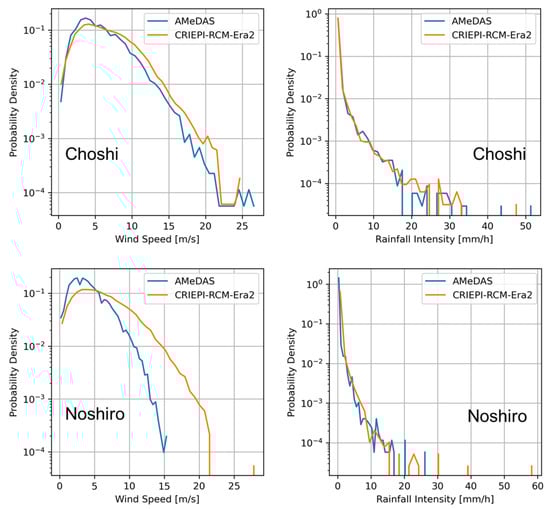 Comparison of wind speed and rainfall intensity between CRIEPI-RCM-Era2 and AMeDAS at Choshi (top) and Noshiro (bottom).