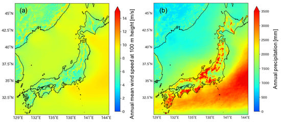 Figure 6 shows the annual mean wind speed at a height of 100 m above ground level and the annual precipitation. In Figure 6a, high wind speeds are observed offshore in the Pacific Ocean from Hokkaido to the Kanto region. Over land, areas of elevated wind speed correspond to mountainous regions. The overall wind speed distribution shows good agreement with the wind resource maps published by NEDO [13]. Figure 6b reveals that annual precipitation is notably high over the Pacific Ocean and in land regions facing the Sea of Japan.