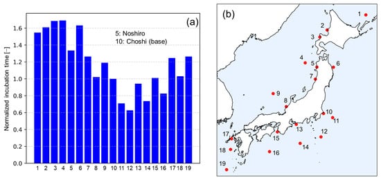 Figure 8a shows the incubation time at 19 representative locations [26] indicated in Figure 8b for the DTU 10 MW wind turbine, normalized by the incubation time at Choshi (location 10). In Hokkaido (locations 1~3), relatively long incubation times were obtained, followed by the Sea of Japan side (locations 4~9) and the area near Kyushu (locations 17~19). In contrast, incubation times tend to be shorter along the Pacific coast (locations 10~16).