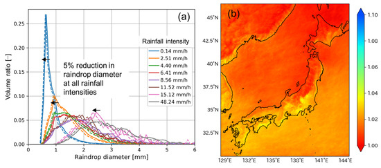In Ref. [27], the annual average raindrop size is d = 1.25–1.3 mm over land except in Hokkaido, whereas over the ocean around Japan, areas with d = 1.2–1.25 mm and d = 1.25–1.3 mm coexist. If we use d = 1.25 mm for the land and d = 1.2 mm for the ocean, the raindrop size is approximately 4% smaller over the ocean than over the land. The influence of this on the incubation time was examined here by applying a 5% reduction to the measured raindrop size distribution, as illustrated in Figure 12a. In Figure 12b, the incubation time is normalized with the incubation time based on the measurement data without modification. From Figure 12b, evaluating incubation time based on land-based raindrop size measurements may lead to an underestimation of incubation time over the ocean by approximately 1–4%. Therefore, incorporating satellite-based inversion data is essential for future research.