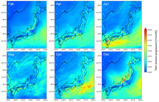 In this study, the first rain erosion atlas for Japan was developed using the simulation-based long-term meteorological dataset CRIEPI-RCM-Era2 and an empirical damage model. The atlas reveals significant geographic and seasonal variability in rain erosion progression, reflecting Japan’s distinctive climate—characterized by four seasons, a humid rainy period in early summer and frequent typhoons from late summer to autumn. The findings are summarized as follows: