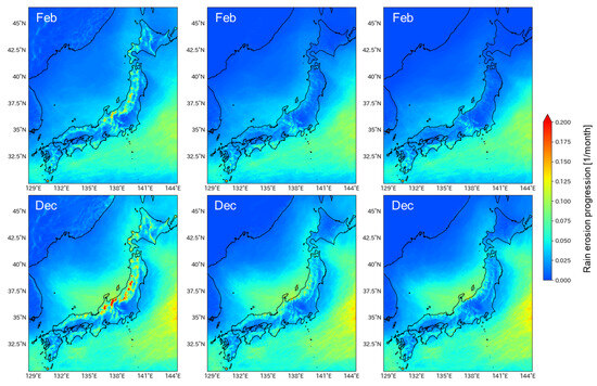 Notably, the erosion progression on the Pacific Ocean side remains unchanged under the thresholding conditions. Therefore, if snow is not the primary driver of erosion, the regional variation in the rain erosion progression in Figure 7 may become more pronounced with a longer incubation time on the Sea of Japan side.