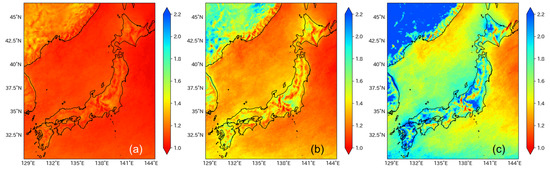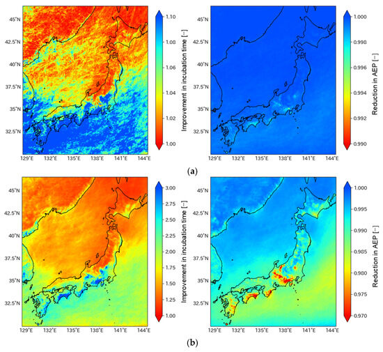 The resulting incubation time is presented in Figure 16, which shows the ratio of incubation time relative to the base case without UV degradation. The incubation time is significantly reduced when UV-induced degradation is considered. The reduction in incubation time exhibits regional variation, with a relatively modest decrease of 20–25% in Hokkaido, approximately 30% along the Japan Sea coast in northern Japan, and a more pronounced decrease of around 35% along the Pacific coast from the Kanto region down to Kyushu.