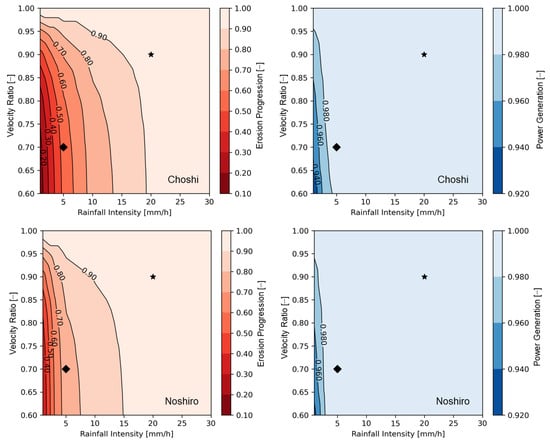 Cumulative erosion progression and power generation (top: Choshi; bottom: Noshiro).