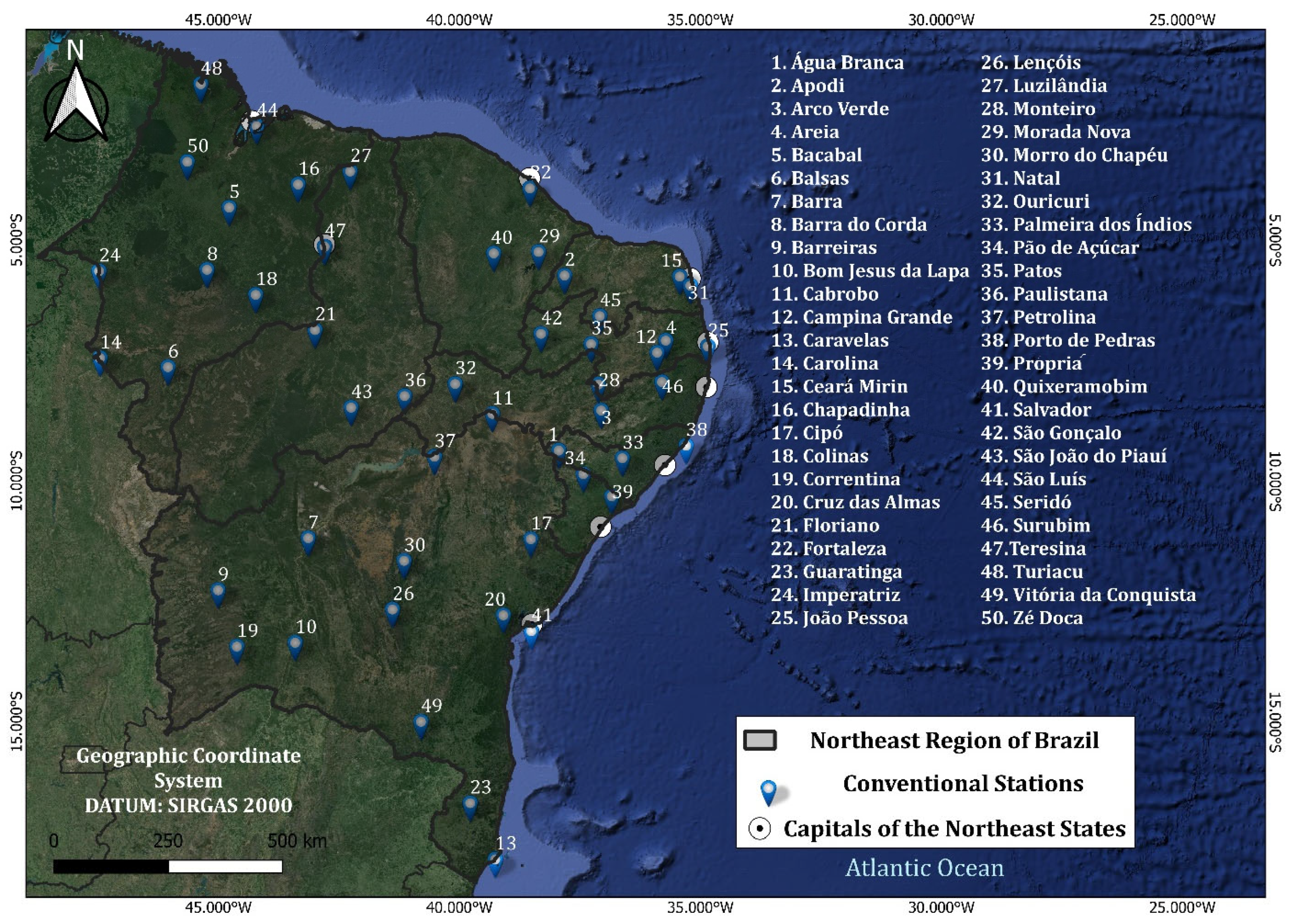 - Morales, F.E.C.; Rodrigues, D.T.; Marques, T.V.; Amorim, A.C.B.; Oliveira, P.T.; Silva, C.M.S.; Gonçalves, W.A.; Lucio, P.S. Spatiotemporal Analysis of Extreme Rainfall Frequency in the Northeast Region of Brazil. Atmosphere 2023, 14, 531. [Google Scholar] [CrossRef]