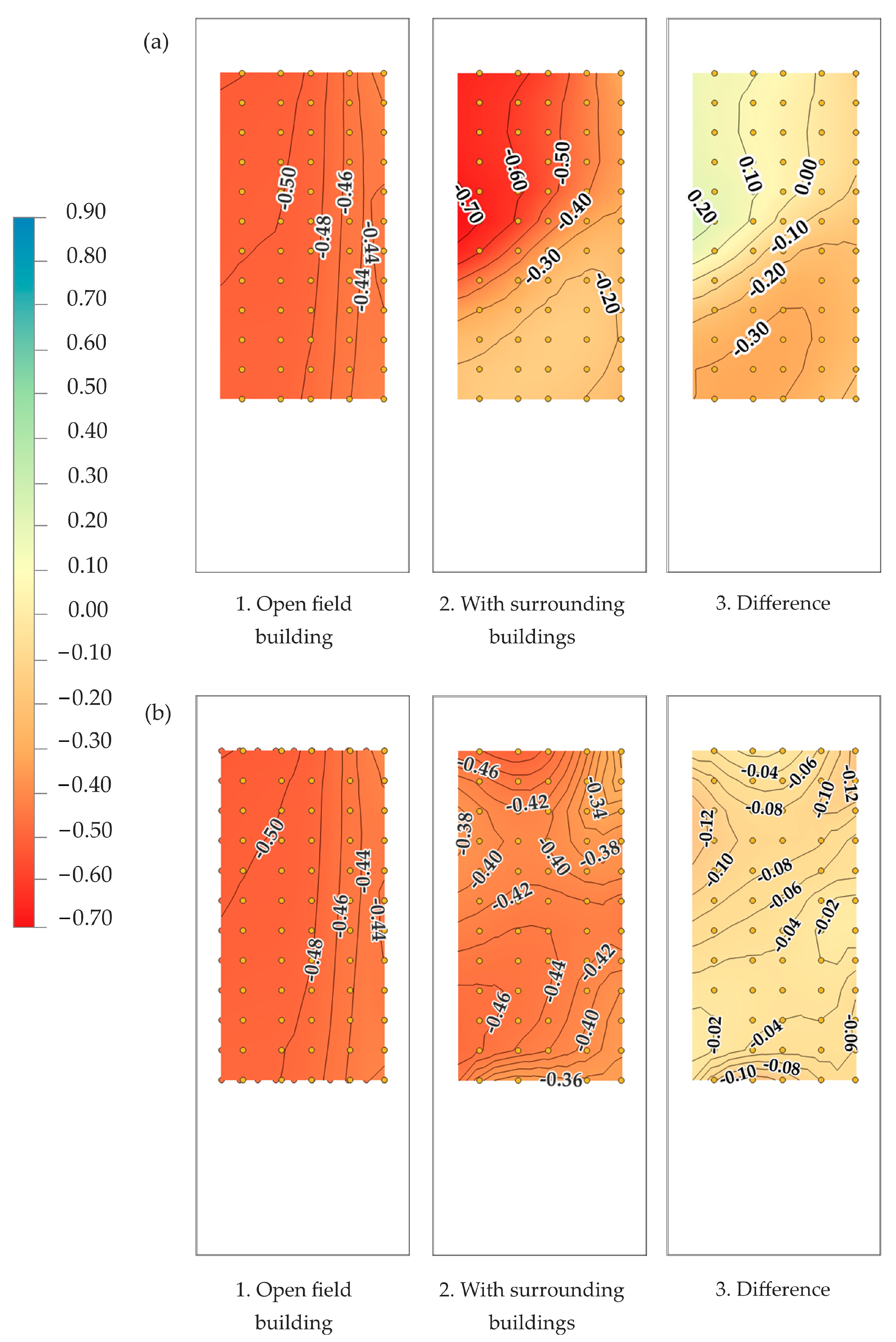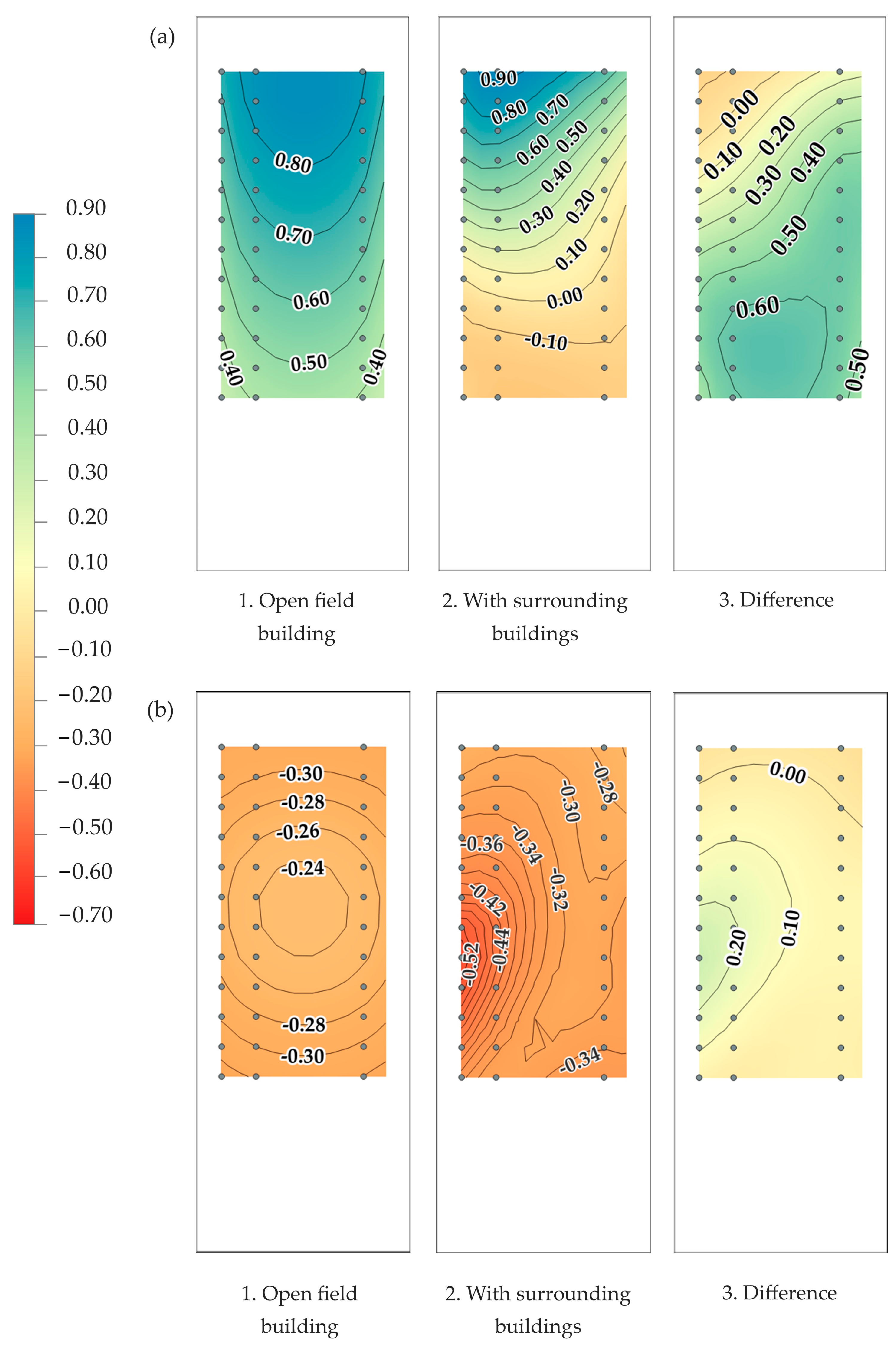 - Liu, S.; Wuxuan, P.; Zhao, X.; Zhang, H.; Cheng, X.; Long, Z.; Chen, Q. Influence of surrounding buildings on wind flow around a building predicted by CFD simulations. Build. Environ. 2018, 140, 1–10. [Google Scholar] [CrossRef]