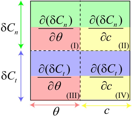 In the above equations, n denotes the number of elements along the blade in the radial direction, and represents the difference between the computed value and the desired value. To get a better idea on the structure of the Jacobian matrix, a schematic is shown in Figure 1. As seen, in the first row, the first (I) and second quadrants (II) describe the rate of change of the normal force coefficient () to the change of the twist angle () and the change of the blade chord (c) at each element, respectively. Meanwhile, in the second row, the third (III) and fourth quadrants (IV) describe the rate of change of the tangential force coefficient () to the change of the twist angle () and the change of the blade chord (c) at each radial element, respectively.