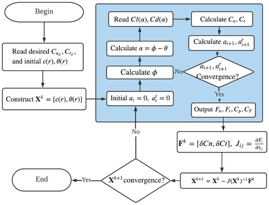 A flowchart for the inverse design method is shown in Figure 2. At first, the desired wind turbine performance and are read from the input files, meanwhile the initial values of the blade geometrical parameters ( and ) are assigned to . Then the BEM code (shown in blue in Figure 2) is performed to provide the computed aerodynamic behavior ( and ). Once and are obtained, the linear algebraic equation in Equation (1) is solved to obtain new values of X. At this step, the -norm is used to check the convergence of the solutions, which is defined as: