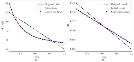 Radial distribution of (a) twist and (b) chord for the S809 wind turbine blade. The red solid lines represent the original twist/chord distributions from the reference, the black-dashed lines represent the initial twist/chord distributions, while the blue dots show the converged twist and chord distributions obtained by the proposed method.