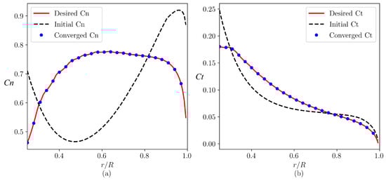 Figure 8 shows the distributions of the thrust and tangential force coefficients. As seen, an excellent agreement between the converged values and the desired values is achieved over the entire blade radial locations. It is noticed that step-like changes are observed on these curves especially for for both the design from the present work that is referenced. This is caused by the change of the airfoil type at those locations instead of any convergence issue with the proposed method.