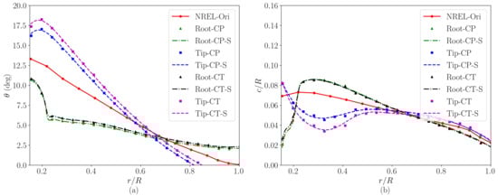 To design the variants of NREL 5 MW wind turbine, the radial distribution of the thrust coefficient () of the original design is modified. For the “Root” and “Tip” variants of design, the thrust coefficients are obtained by adding a linear function with zero mean to the original distribution. During the inverse design process, the distributions of were slightly modified by multiplying a value approximately one in an iterative way to keep approximately the same power coefficient or thrust coefficient as the original design. Figure 9 shows that the same initial twist and chord distributions are used in the inverse design of the (i) Root-CP, (ii) Tip-CP, (iii) Root-CT, and (iv) Tip-CT cases. The red lines represent the twist and chord distributions of the original NREL turbine, while the green lines represent the initial values used in the other four cases. As seen, the same initial values are used for all cases.