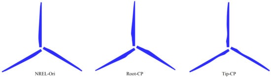 where is the flapwise bending moment, which can be calculated using Equation (8). As seen, when compared with the original design (NREL-Ori), the from the Root-CP and Root-CT turbine designs is reduced by 3.24% and 6.48%, respectively, which, on the other hand, is increased by and for the Tip-CP and Tip-CT designs, respectively.