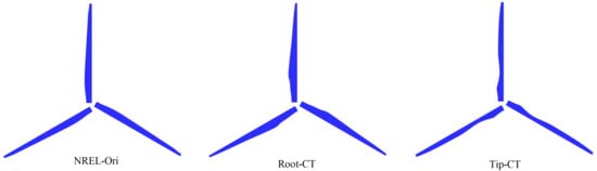 The performance of the variants of the NREL 5 MW turbine is shown in Table 2. It is seen that when keeping the same power coefficients, the thrust coefficients of the Root-CP and Tip-CP turbines are slightly higher than the NREL-Ori turbine at −2.76% and 8.47%, respectively. While keeping the same thrust coefficients, compared with the NREL-Ori turbine, the power coefficients of the Root-CT and Tip-CT are somewhat less, at −1.33% and 4.68%, respectively.