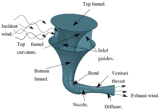 Power generation by HAWT systems relies on the swept area of the rotor and drastically on the incident wind speed. The reliance on incident wind speed is such that if it is increased slightly and the swept area is reduced, more power can still be realized [4,5]. Due to this consideration, wind speed augmentation on smaller wind turbine systems has gained popularity as a way to circumvent most of the drawbacks suffered by big propeller wind turbine systems [6]. Since the investigation of the idea of ducted wind turbines, a lot of studies have been focused onto augmenting wind using of ducts. The recent studies by [7] show that wind augmentation using ducts is still an important aspect of wind energy production enhancement. Shown in Figure 1 is a novel concept within the sphere of ducted wind turbines that was named INVELOX by [8] after its ability to increase incident wind.